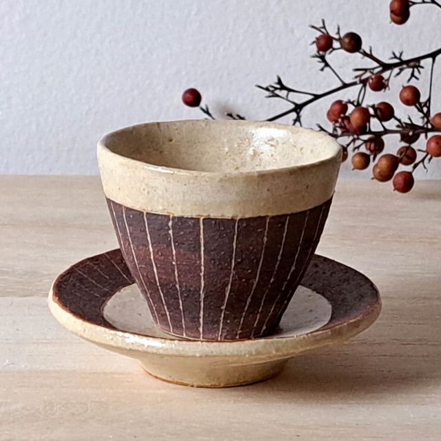 【サイズ】 湯飲み:口径6㎝ 高さ4.5㎝ 容量50ml(八分目) ソーサー:直径8㎝ 高さ2㎝(高台込み) *湯飲みと茶托 1セットとなります 【素材】陶土(信楽) 【作家】大野 素子 大人気の弁柄シリーズの新入荷です。 信楽の陶土の自然で優しい風合いと、海老茶と無垢のコントラスト。 繊細な線文が美しい小さな湯飲みと茶托のセットです。 一点一点手捻りで丁寧に作りこまれ、さらに繊細な文様を刻んでゆきます。 中国茶などによく使われる大きさで、お揃いで急須もご用意があります。 手捻りとは思えないほどの美しいフォルムと独特の弁柄の色合いは、単なる器の域を超え、オブジェのような美しさです。 茶器セットとしては勿論ですが、酒器セットとしても素敵です。 茶托をお皿代わりにお酒の肴やお塩などをちょこんと載せて…。 上質な時間を演出してくれる美しい器です。 *こちらでは、「弁柄 湯飲み&茶托セット」単品(1セット)での販売となります。 ●「弁柄 急須」のご購入はこちらから https://enishishop.thebase.in/items/127894644 ●「弁柄 お茶碗(縦縞)」のご購入はこちらから https://enishishop.thebase.in/items/89798094 ●「たたらオーバルプレート(黒)」のご購入はこちらから https://enishishop.thebase.in/items/89796609 ====================== 【大野素子さんプロフィール】 奈良県生まれ 1994年 陶芸を始める 現在、奈良県生駒 高山で制作 1995年、1996年、1998年と女流陶芸展入選。 素朴でありながらも繊細で優しい器たちは、彼女の人柄そのものを彷彿とさせます。日常の中に嫋やかに溶け込みながらも、しっかりと存在感を放ち、いつまでも大切にしたくなるような器を作り続けています。 有名料理店などへの起用実績などもある大人気の作家です。 ====================== 【商品のご使用上の注意】 ・電子レンジ:△ 温め程度なら可能です。 陶器は吸水性があります。長時間水に漬けっぱなしのあと、かなり熱くなるまて加熱しますと器の中の水分が膨張して割れる事があります。 ・食器洗い乾燥機: 洗浄については× 水圧で器同士があたると欠ける可能性があります。 乾燥については〇 カビを防ぐ効果が期待できます。 ・オーブン:✕ おすすめできません。 ====================== 【送料について】 当店は重量制の送料を設定しております。 こちらの商品単品での送料は『ゆうパック60サイズ(全国一律800円)』ですが、同サイズのものを複数個ご購入の際は『ゆうパック80サイズ(全国一律1,100円』の送料が適用される場合がございます。予めご了承ください ◆一点一点手捻りで仕上げられるため、サイズ、色合い、文様に多少の誤差がございます。 また、お客様のモニター環境によって、画像の色が実物と異なって見える場合がございます。 予めご了承ください。 ◆実店舗での販売も兼ねているため、ご注文商品をご用意できない場合がございます。あらかじめご了承ください。