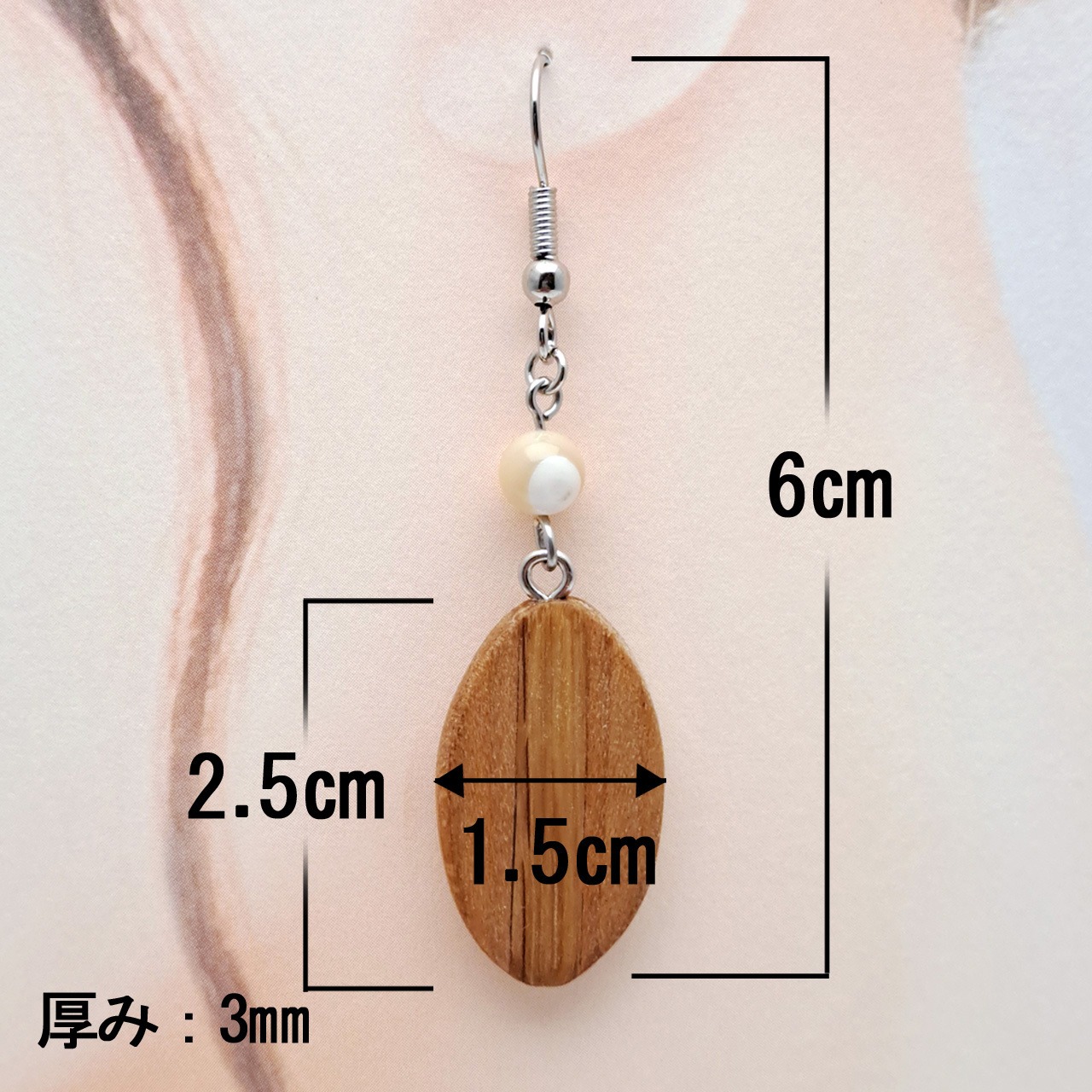組木で作られたサーフボードのような形の木製パーツにクリームと白のマーブル模様のビーズが夏らしいピアス。