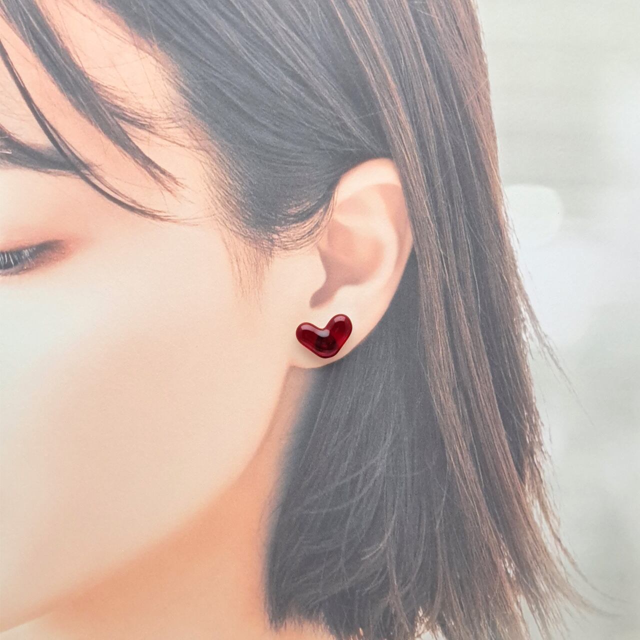 いくつになってもハートのモチーフは乙女心をくすぐるもの。シンプルですが存在感のあるピアスです。ともすれば子供っぽくもなりがちなハートモチーフを大人の遊び心へと変えているのは、この深い赤色のガラスのなせる業。