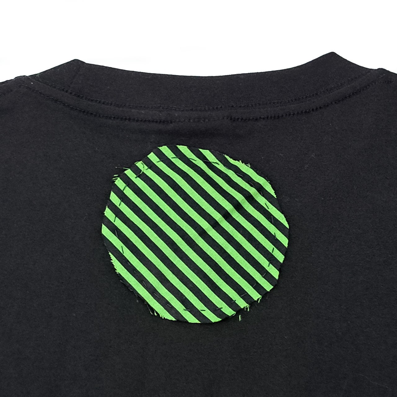 イタリア・ミラノの電車の路線図に「CIMIANO(チミアーノ)」「CAIAZZO(カイアッツォ)」等々、ミラノ近郊の駅名がステッカーのように描かれています。わざとかすれたようにプリントしたり、シルバーの箔を使ったり、細かな技もシルクスクリーンならではの風合いです。背面にはグリーンと黒のストライプの生地をパッチワークしたアクセントで、バックスタイルにも遊び心が!