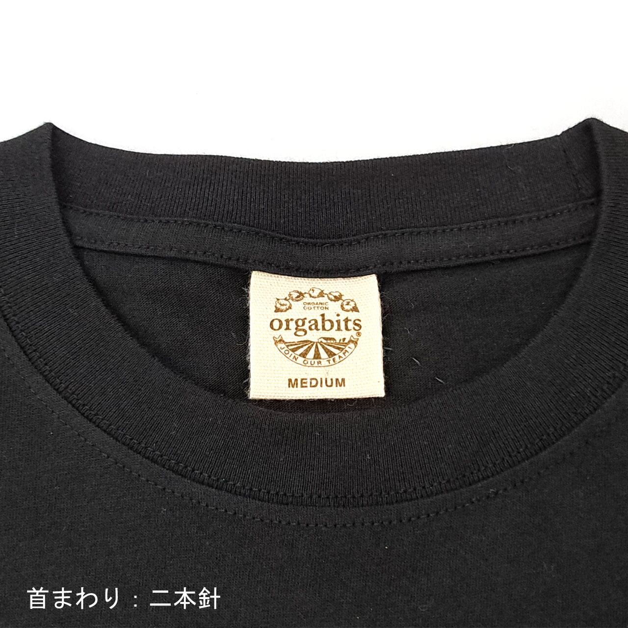 Tシャツの生地は5.3ozのオーガニックコットン100%。オーガニックコットンは細かく柔らかな繊維を持ち、一般的なコットンに比べて摩擦が少なくので肌に優しい感触を与えてくれます。 通気性が良く、湿気を逃がす特性を持つため、長時間着用してもムレにくく、常に快適な状態を保ちます。裾まわりや袖口、首まわりは二本針仕様で、ヨレたり伸びたりしにくくなっています。