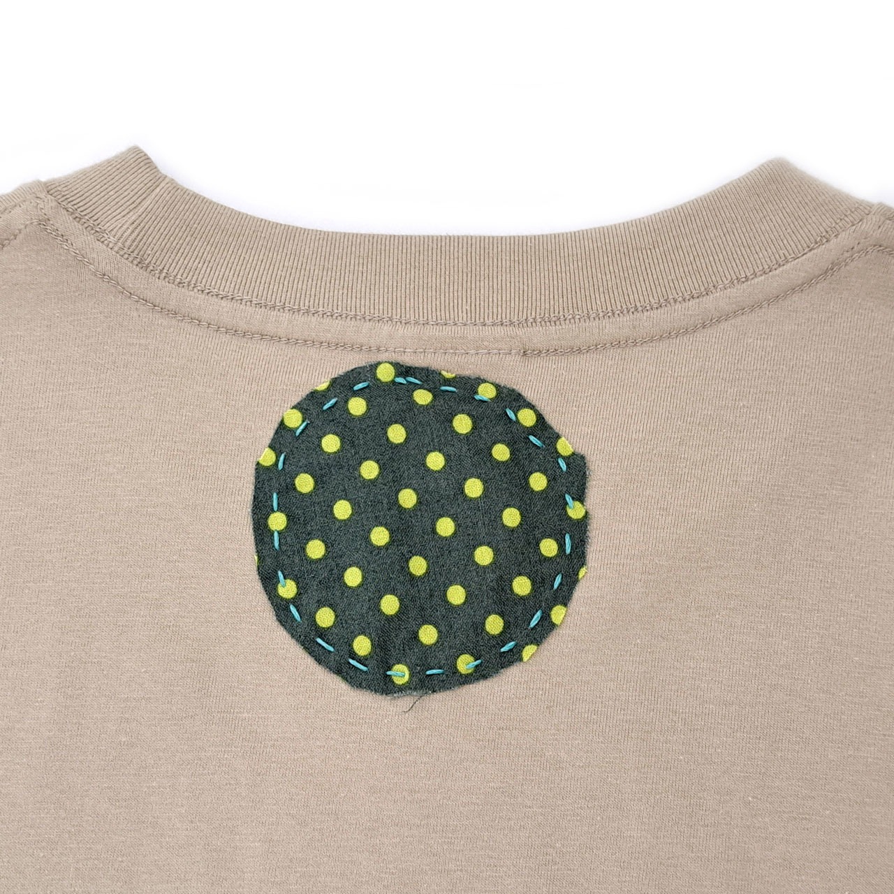 イタリア・ミラノの電車の路線図に「DUOMO(ドゥオーモ)」「LORETO(ロレート)」等々、ミラノ近郊の駅名がステッカーのように描かれています。わざとかすれたようにプリントした細かな技もシルクスクリーンならではの風合いです。背面にはグリーンに黄色の水玉模様の生地をパッチワークしたアクセントで、バックスタイルにも遊び心が!