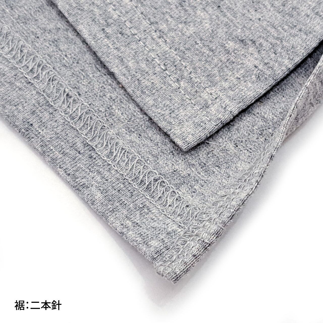 Tシャツの生地は綿100%、6.2ozのマックスウエイトで、ざっくりとしたコシとハリのある風合い。オープンエンド糸を使用しており、吸収性と速乾性に優れ、サラリとした着心地です。裾まわりや袖口、首まわりは二本針仕様で、ヨレたり伸びたりしにくくなっています。