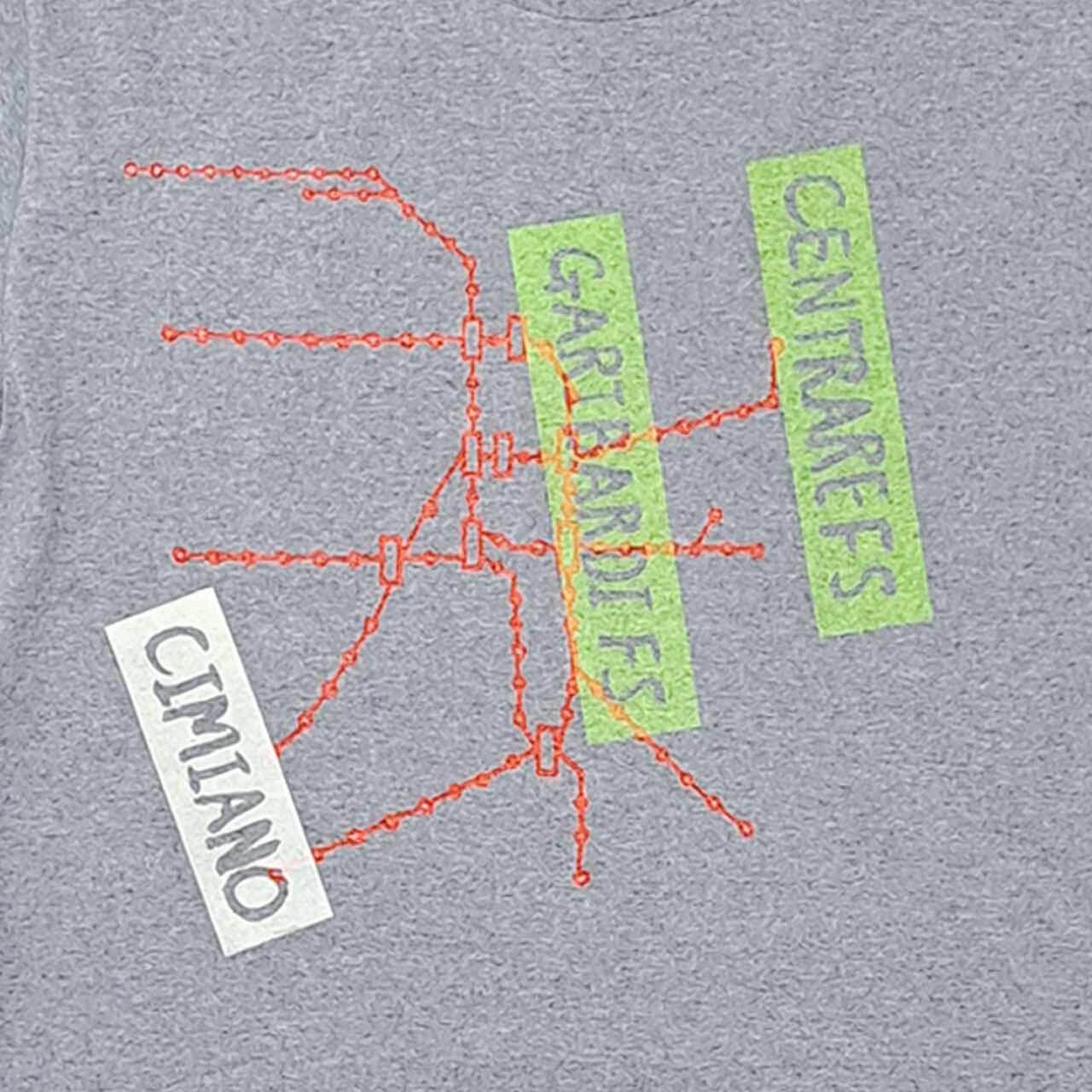 イタリア・ミラノの電車の路線図に「CIMIANO(ドゥオーモ)」「GARIBARDI(ガリバルディ)」等々、ミラノ近郊の駅名がステッカーのように描かれています。ビビットなオレンジとグリーンのコントラストも鮮やか。わざとかすれたようにプリントしたり、細かな技もシルクスクリーンならではの風合いです。背面にはグリーンに黒のストライプの生地をパッチワークしたアクセントで、バックスタイルにも遊び心が!