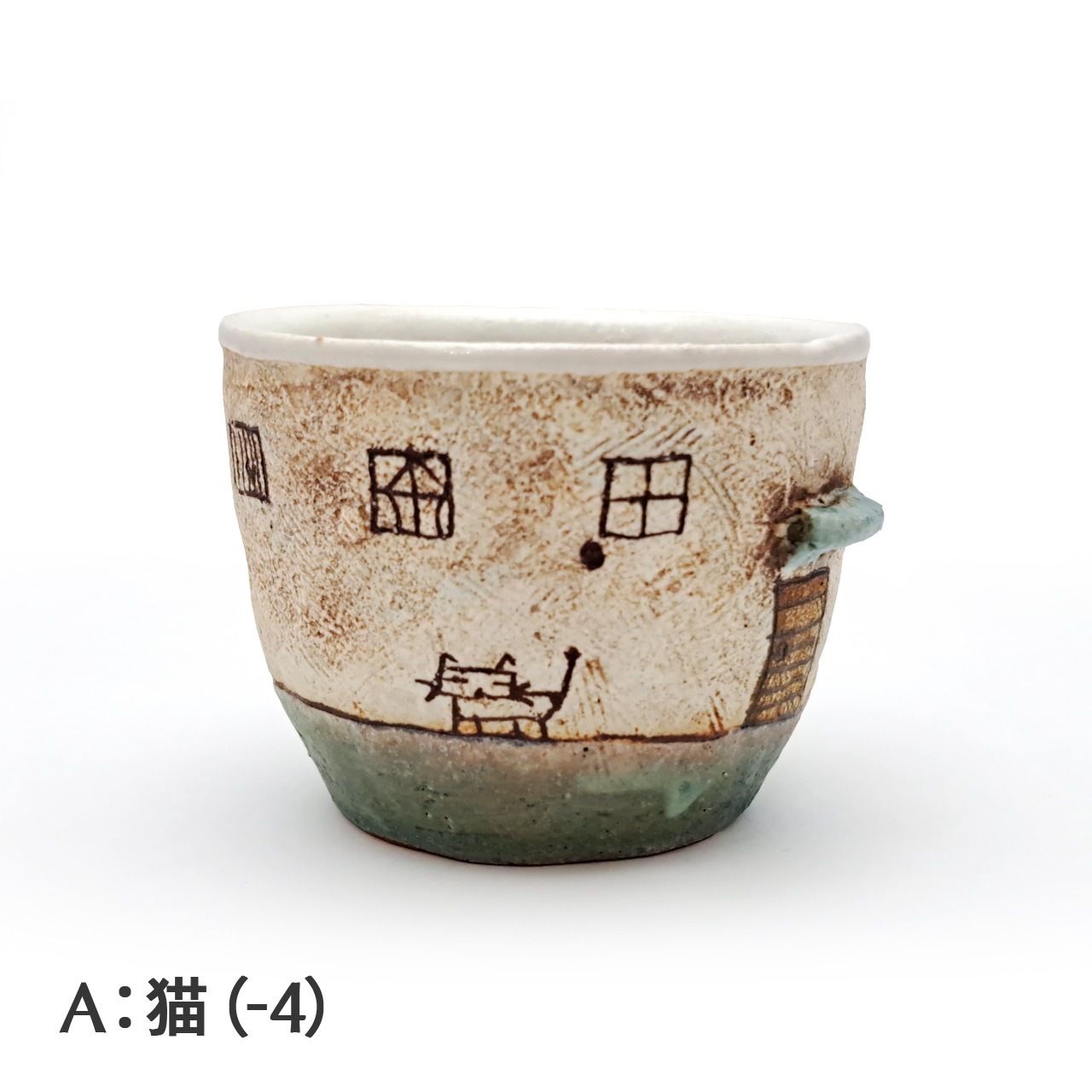 壁沿いには階段や玄関の軒などは半立体になっており、ドールハウスのような細かな仕事も「めいポタ」らしさを感じます。カップの下部にはブルーグリーンの色付けがされており、白い壁とのコントラストも美しいです。
