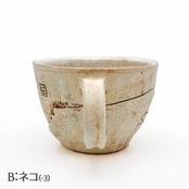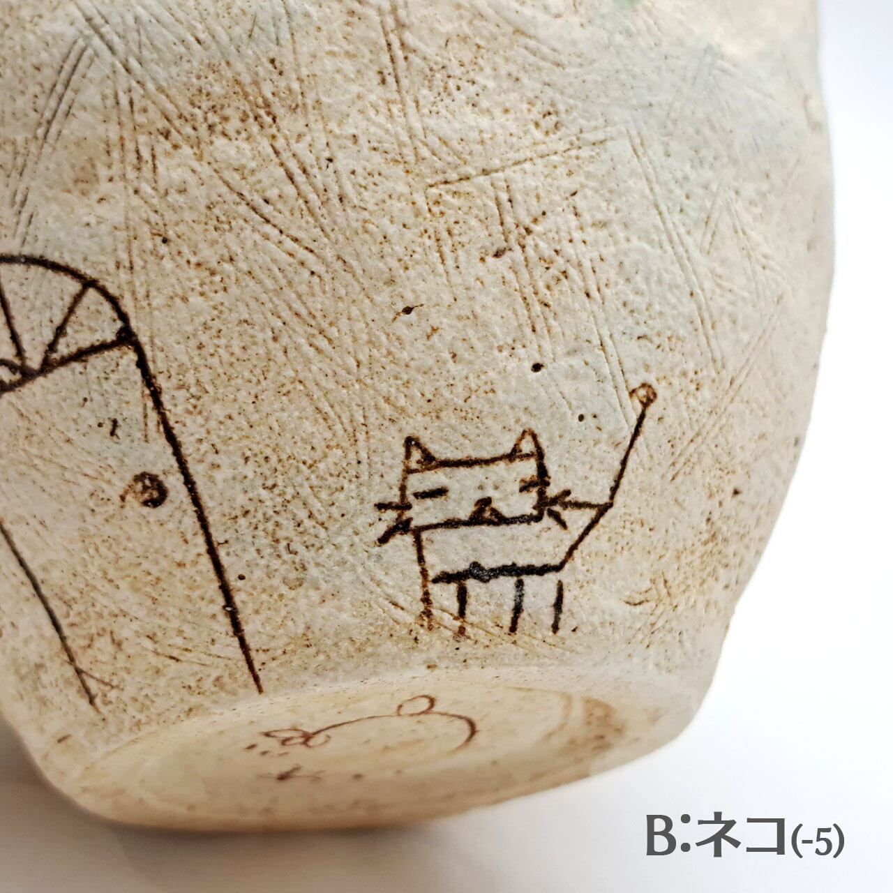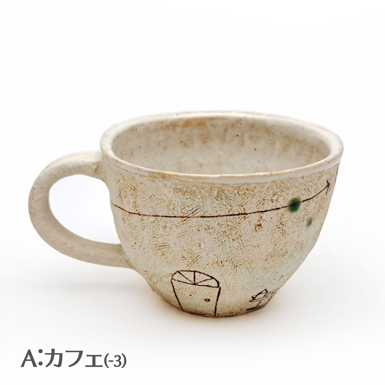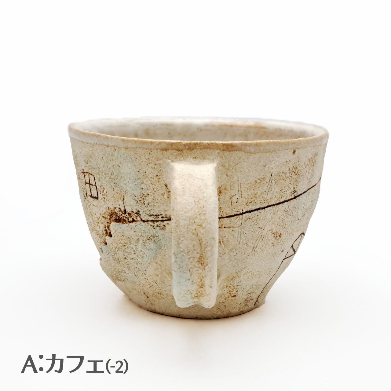 Aはカフェの「イスとテーブル」、Bは「ねこ」です。それ以外の面はほぼ同じモチーフですが、微妙に形や位置が違います。また手捻りならではのゆがみも個体によって違います。