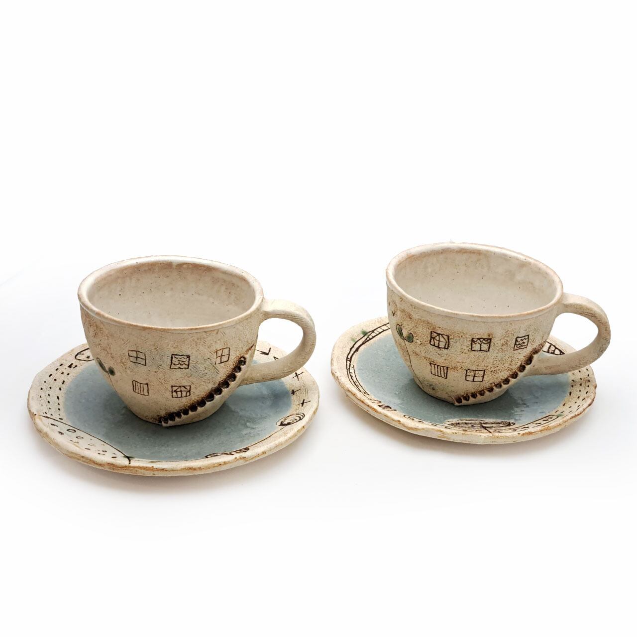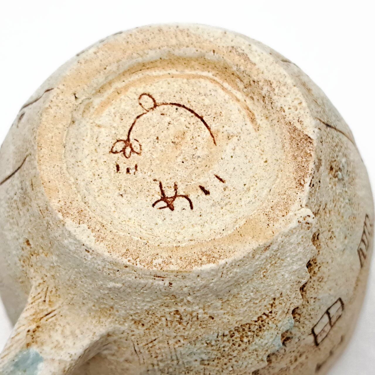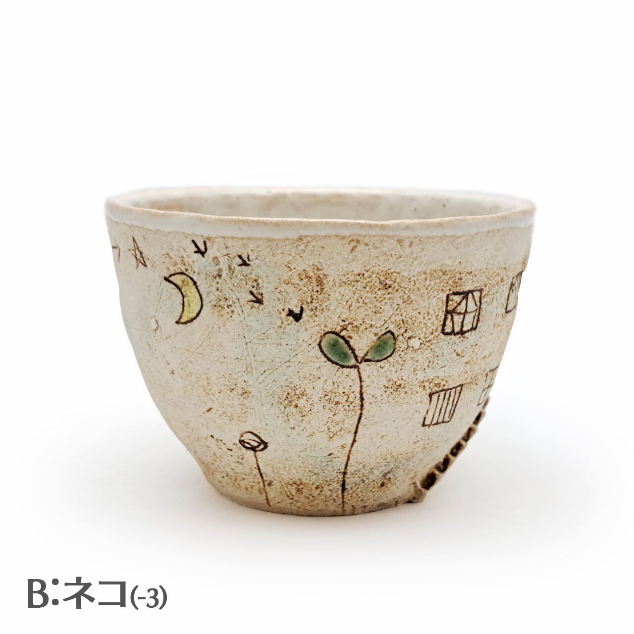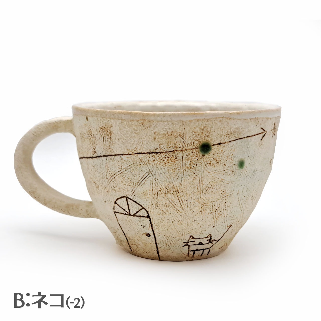 Aはカフェの「イスとテーブル」、Bは「ねこ」です。それ以外の面はほぼ同じモチーフですが、微妙に形や位置が違います。また手捻りならではのゆがみも個体によって違います。
