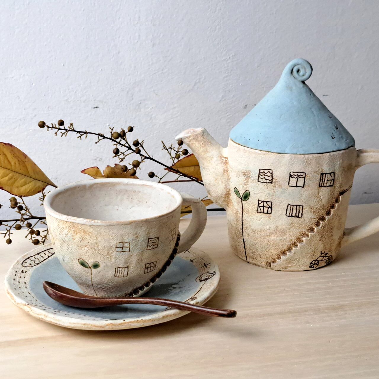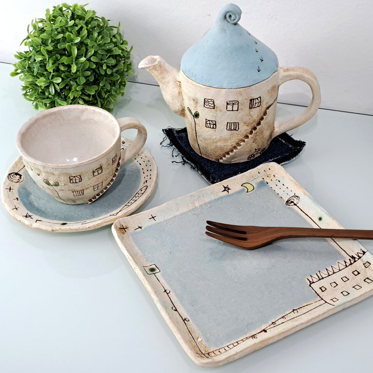 カップソーサーとして使える玉寸皿やポット、プレートのご用意があり、セットにするとさらに世界観が広がります。