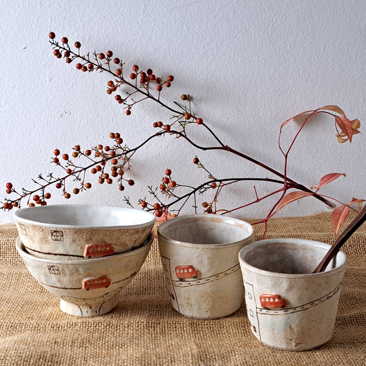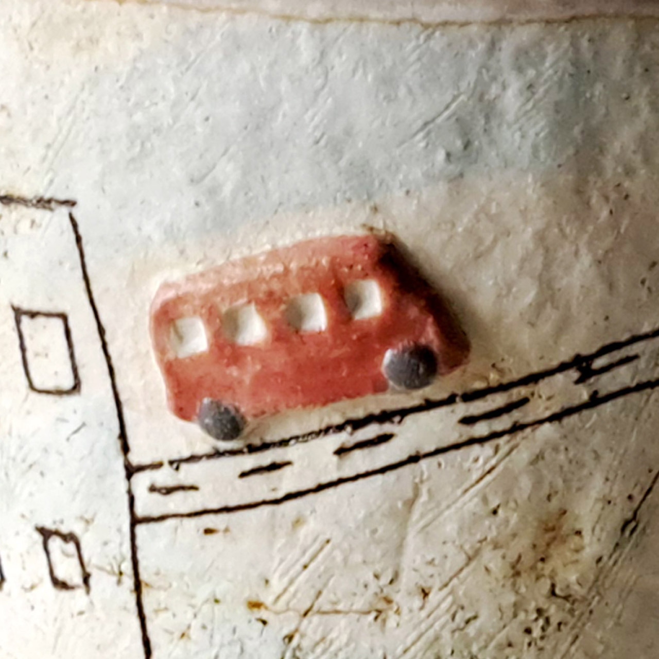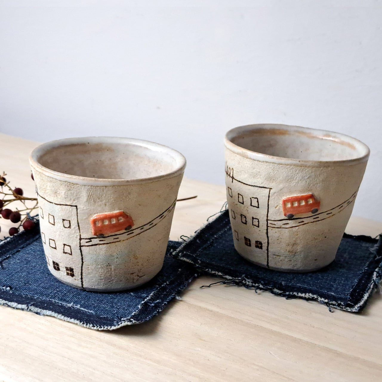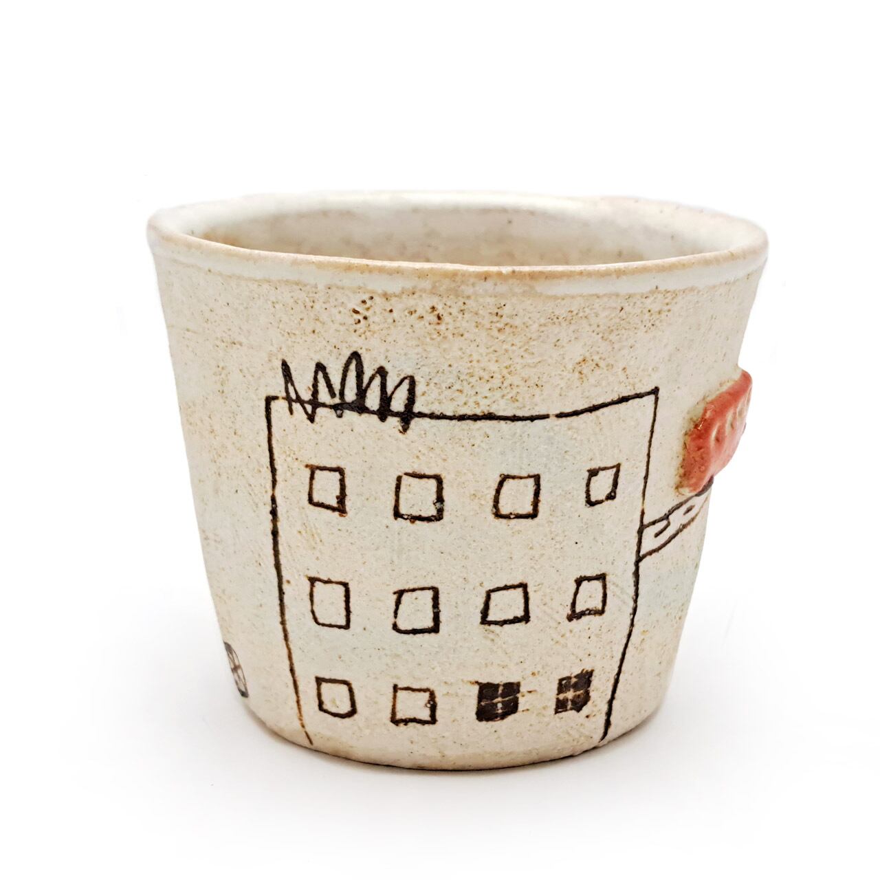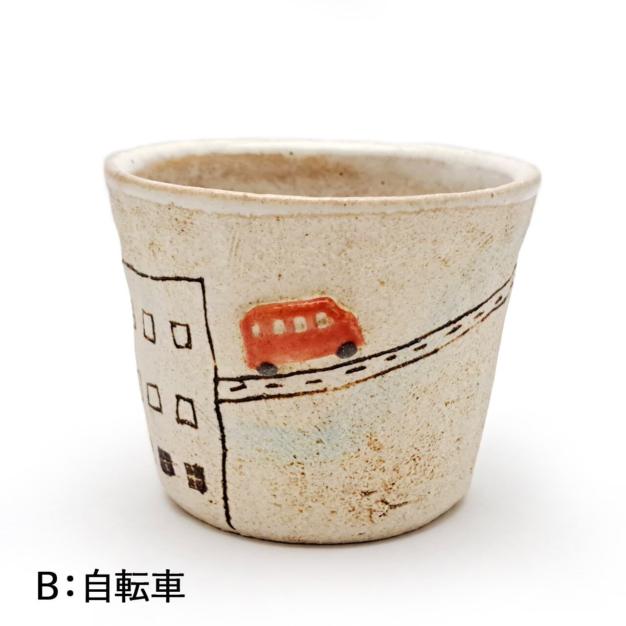 赤いバスは半立体になっており、カップの外側は焼き締めでザラッとした質感、赤バスとカップの内側は透明な釉薬が施されています。