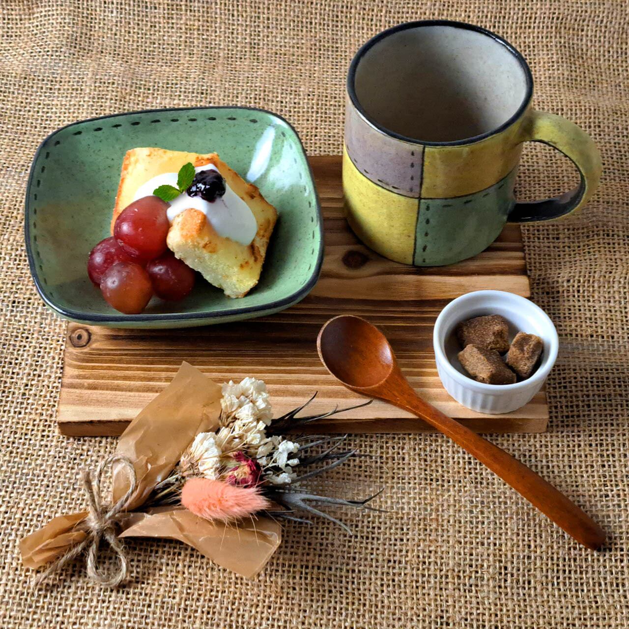 黒土の上に色化粧土を刷毛で塗り、もようを描いているため、上から塗った色の下から、土の色である黒がふわふわとのぞいて、ちょうどいい感じのポップ感と明るすぎない落ち着いた色合いが和にも洋にも馴染みます。