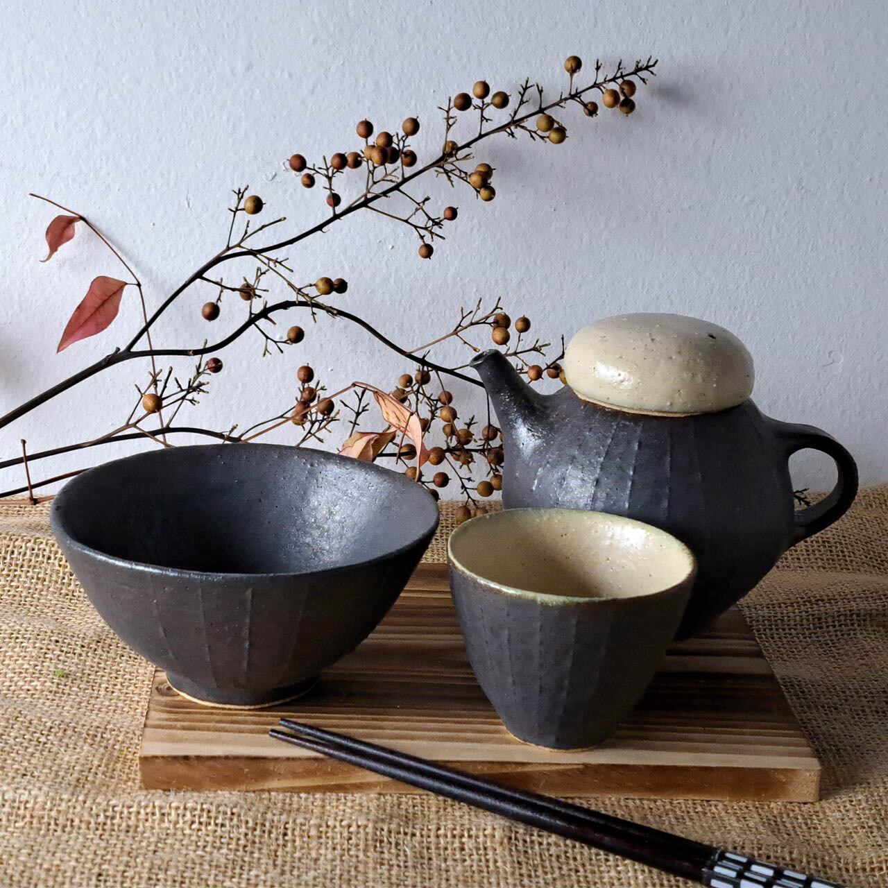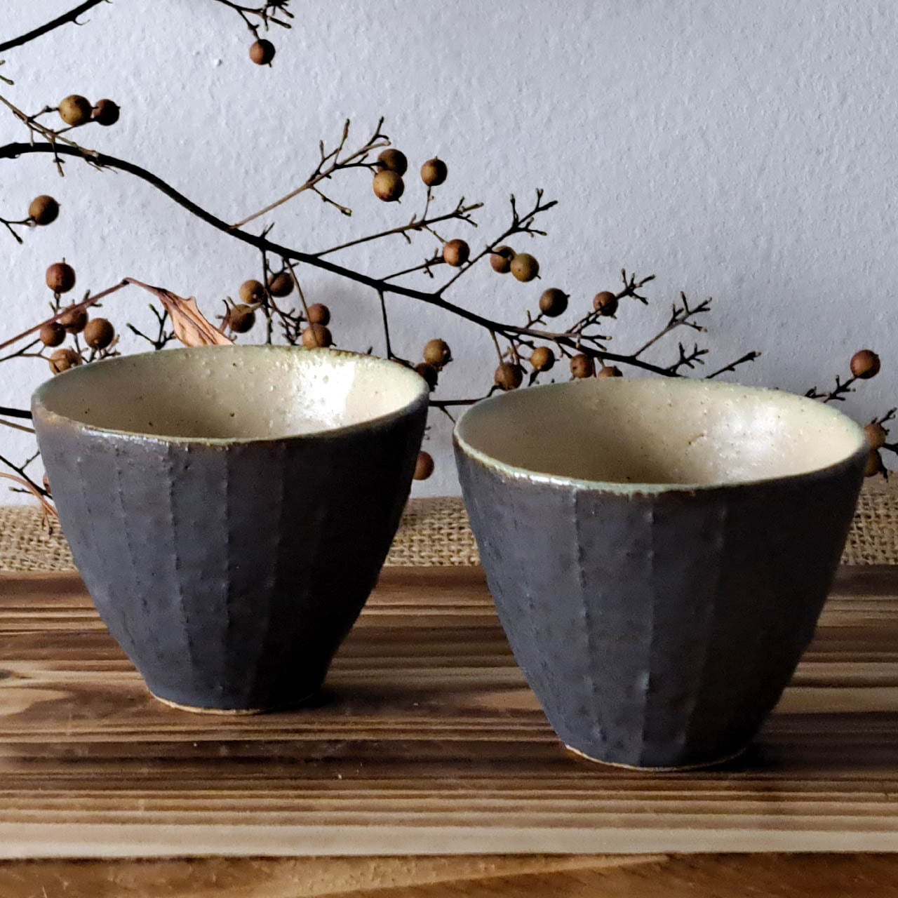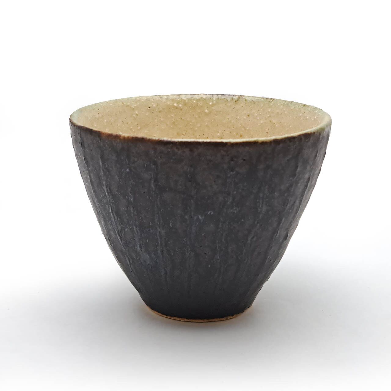 信楽の土の自然で優しい風合い。ふくよかなボディに施された立筋のレリーフと黒釉薬の錆茶の混じった絶妙な黒が、まるで南部鉄器のような趣を醸し出し、内側の無垢な釉薬の色合いとのコントラストも美しい湯飲み。ご好評につき、再入荷です。