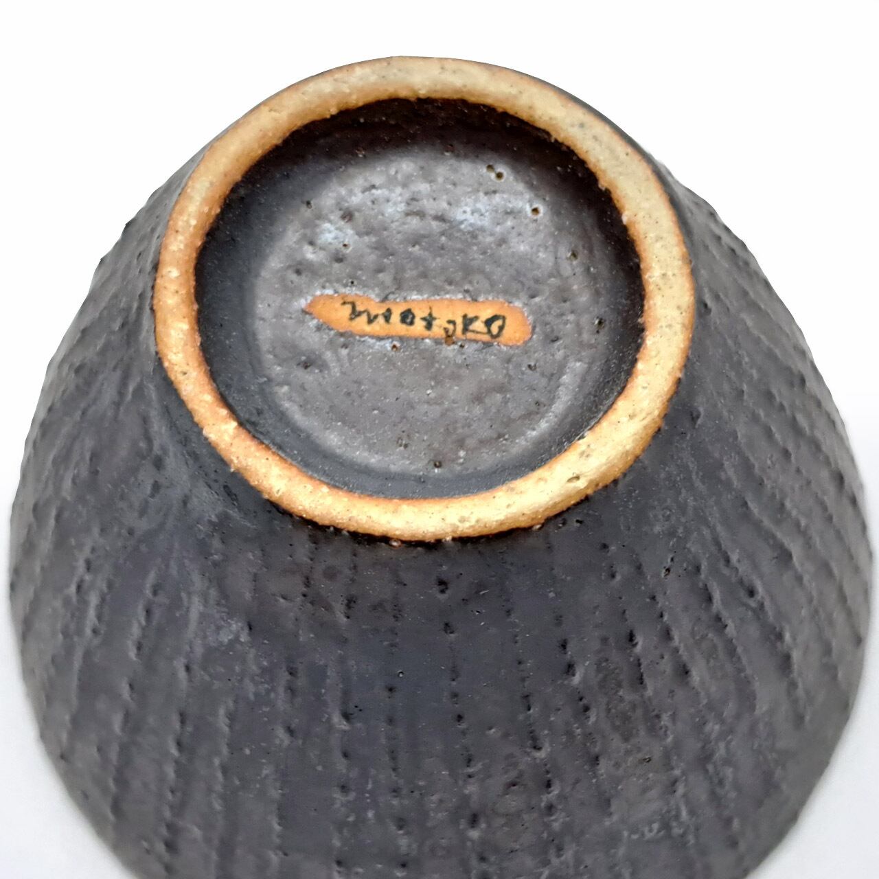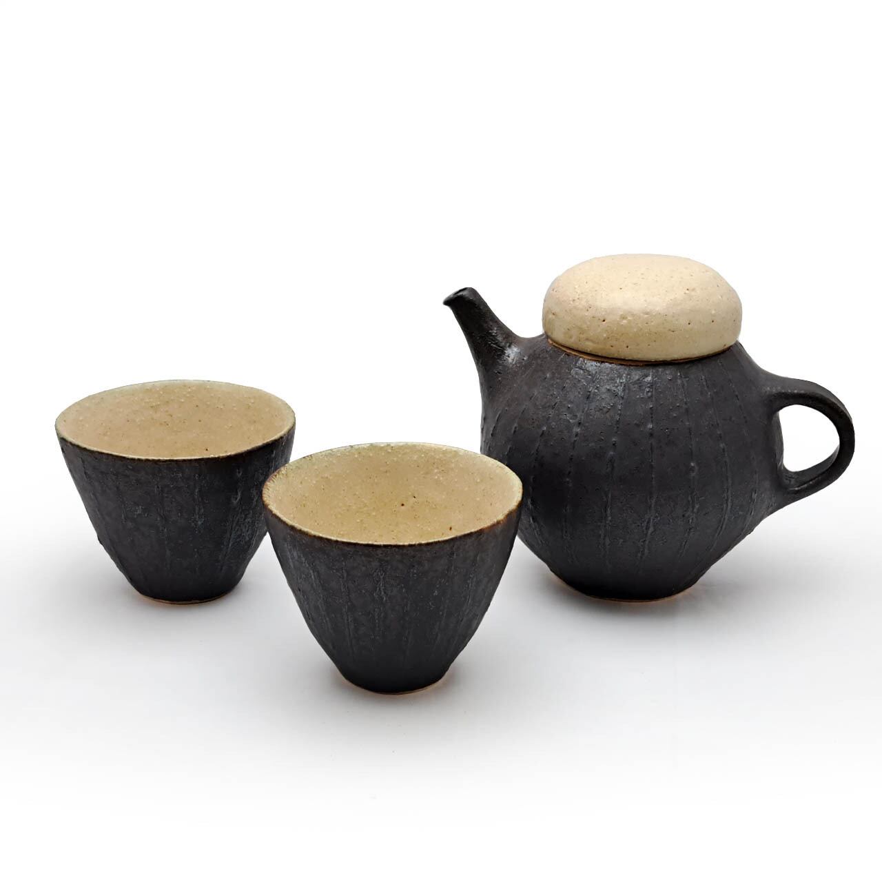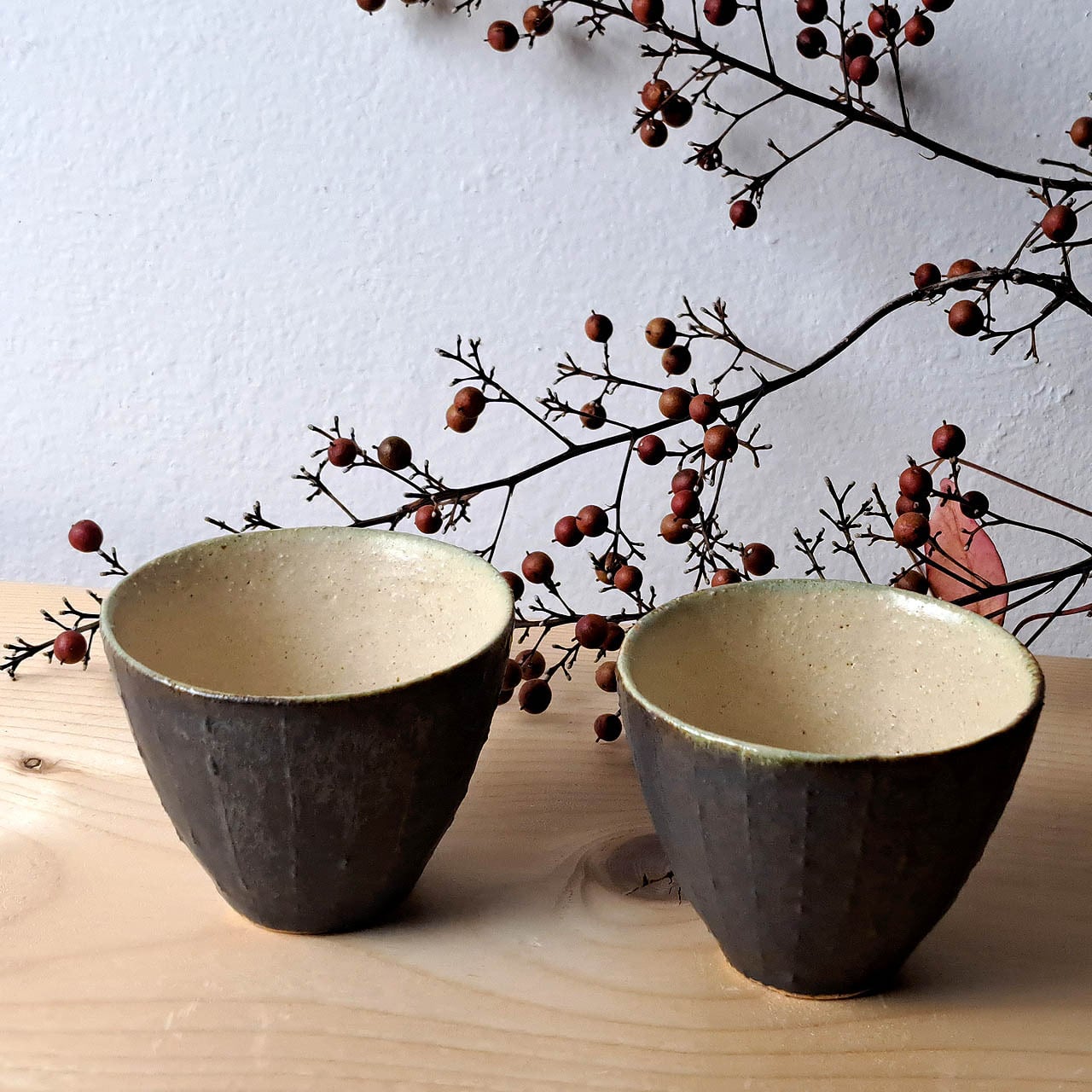 信楽の土の自然で優しい風合い。ふくよかなボディに施された立筋のレリーフと黒釉薬の錆茶の混じった絶妙な黒が、まるで南部鉄器のような趣を醸し出し、内側の無垢な釉薬の色合いとのコントラストも美しい湯飲み。ご好評につき、再入荷です。