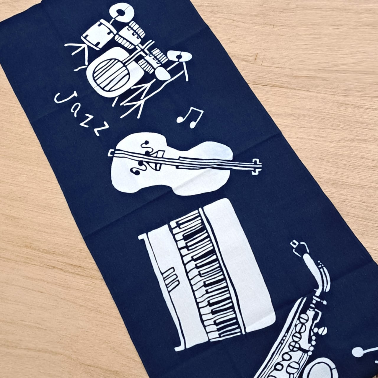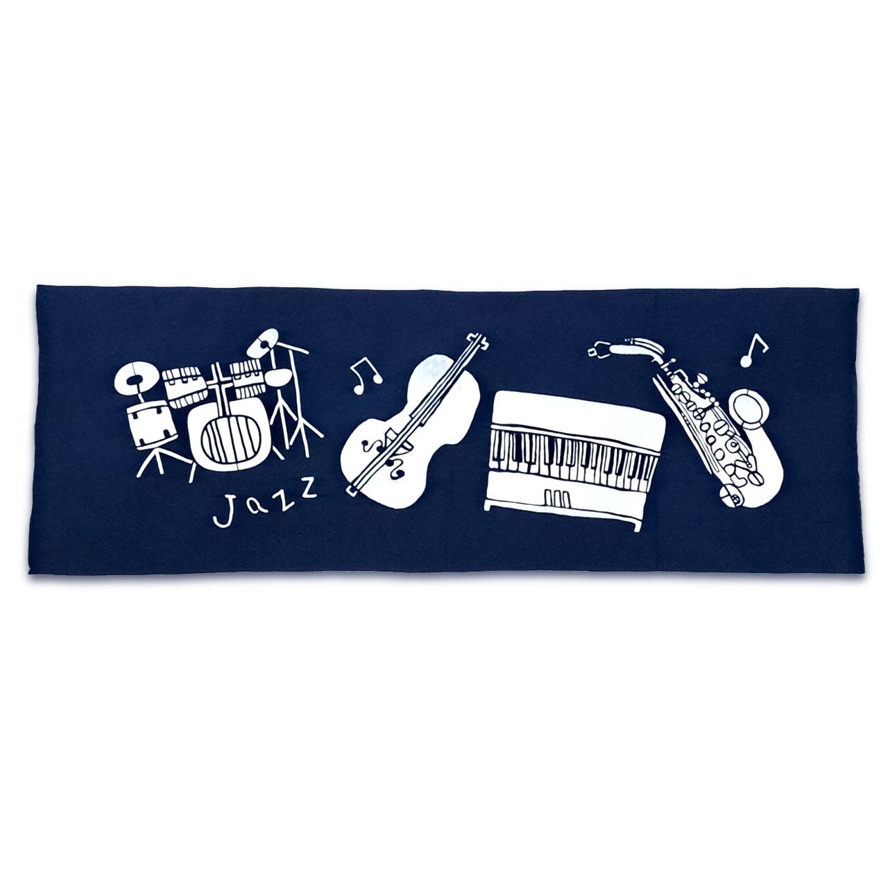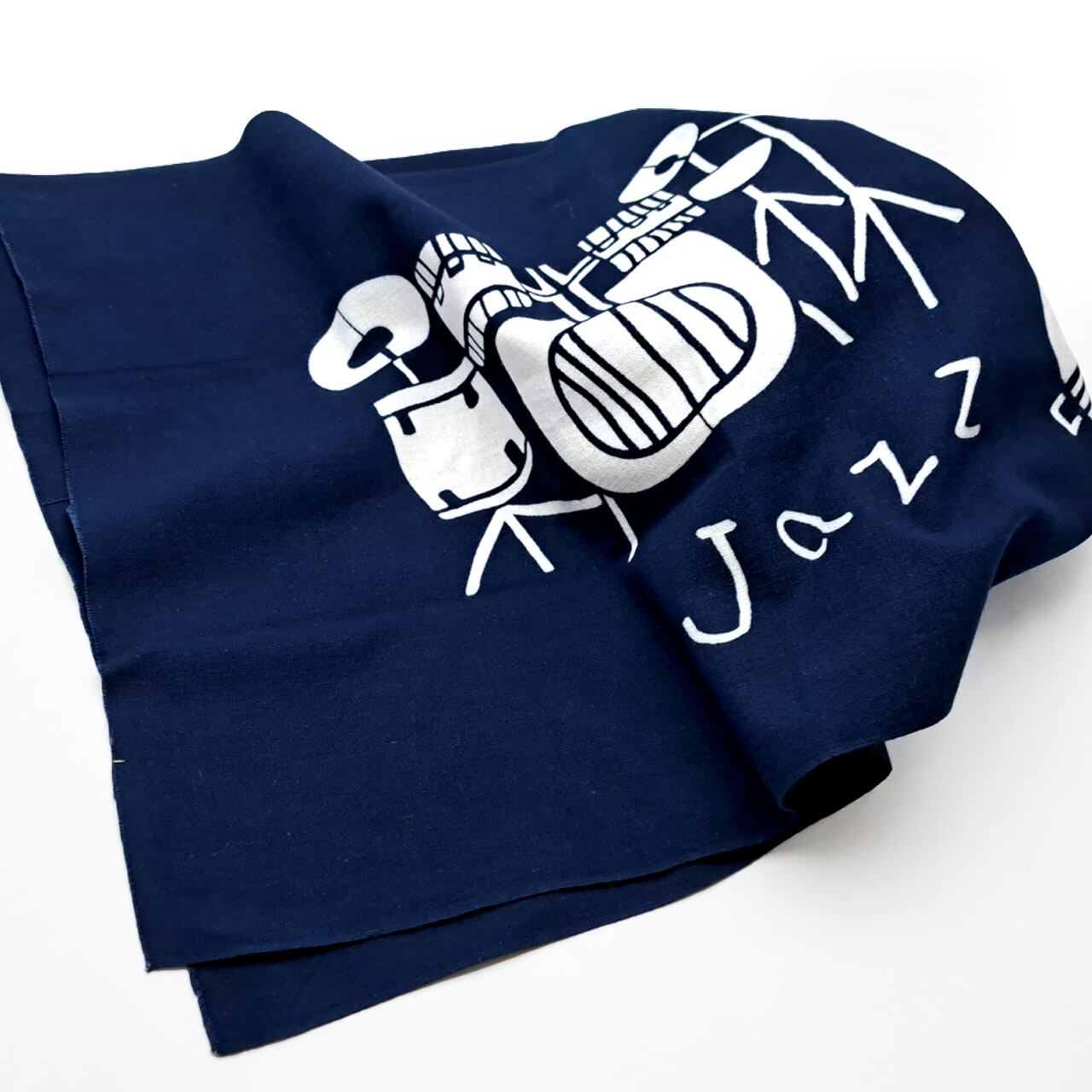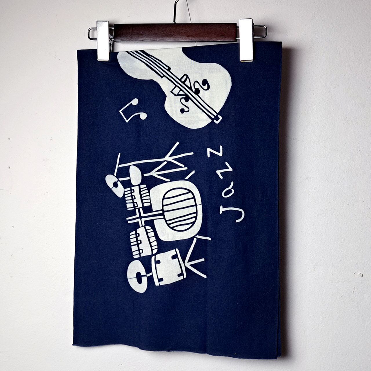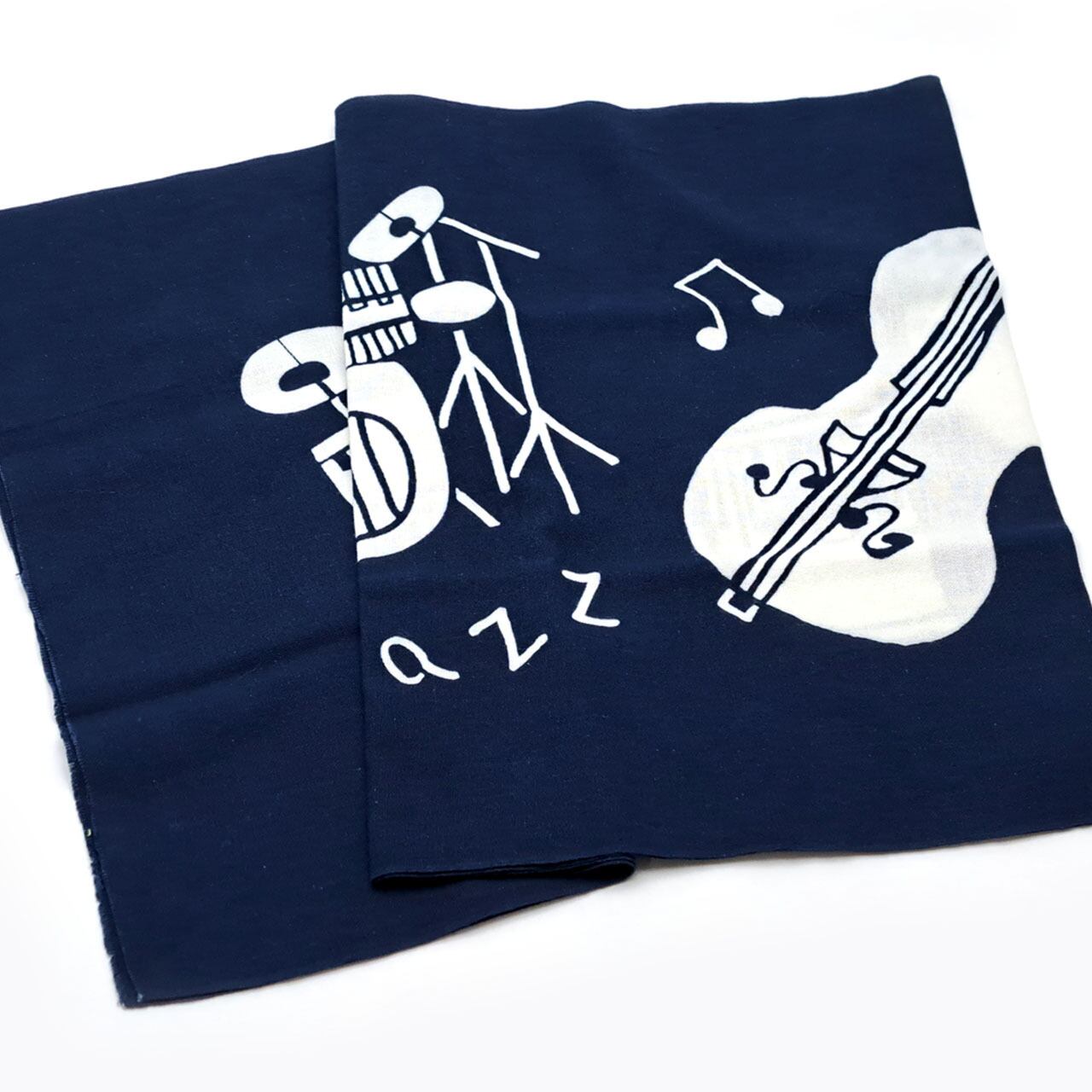 ドラムやウッドベース、ピアノやサックスなどがJAZZを奏でるおしゃれな図柄の藍型染め手ぬぐい。東京都町田駅周辺で行われる「町JAZZ」をイメージして描かれています。