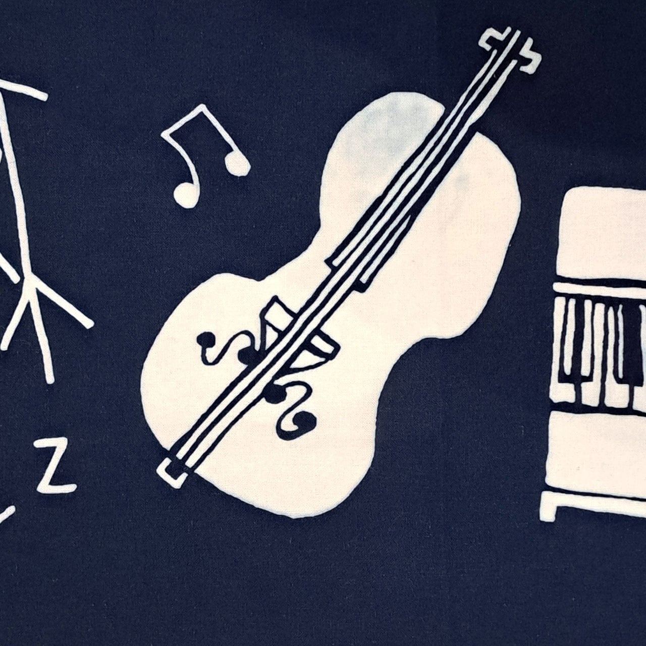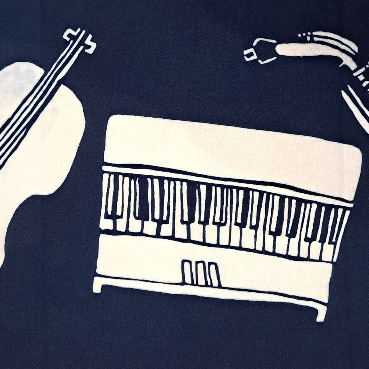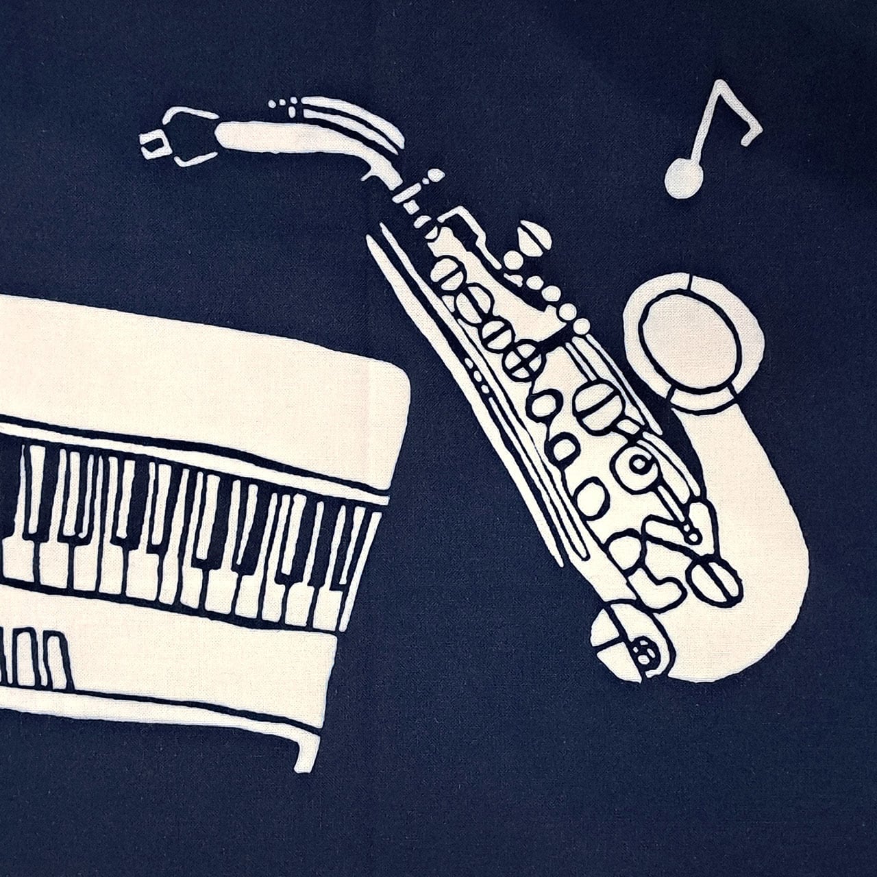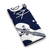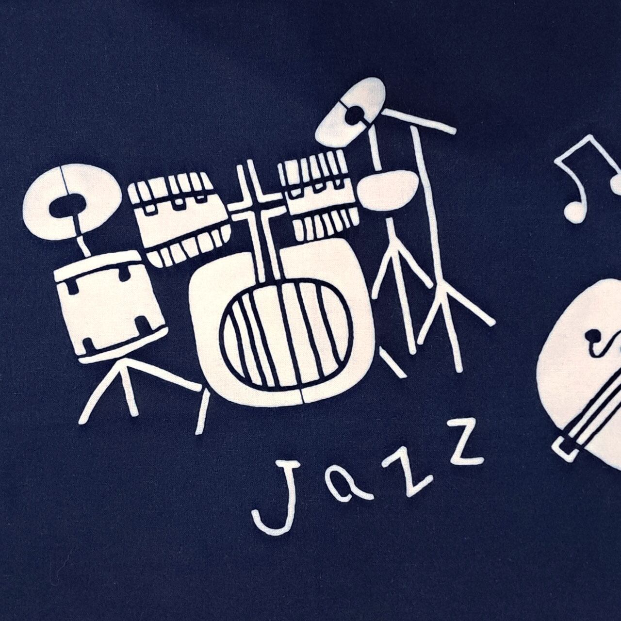 ドラムやウッドベース、ピアノやサックスなどがJAZZを奏でるおしゃれな図柄の藍型染め手ぬぐい。東京都町田駅周辺で行われる「町JAZZ」をイメージして描かれています。