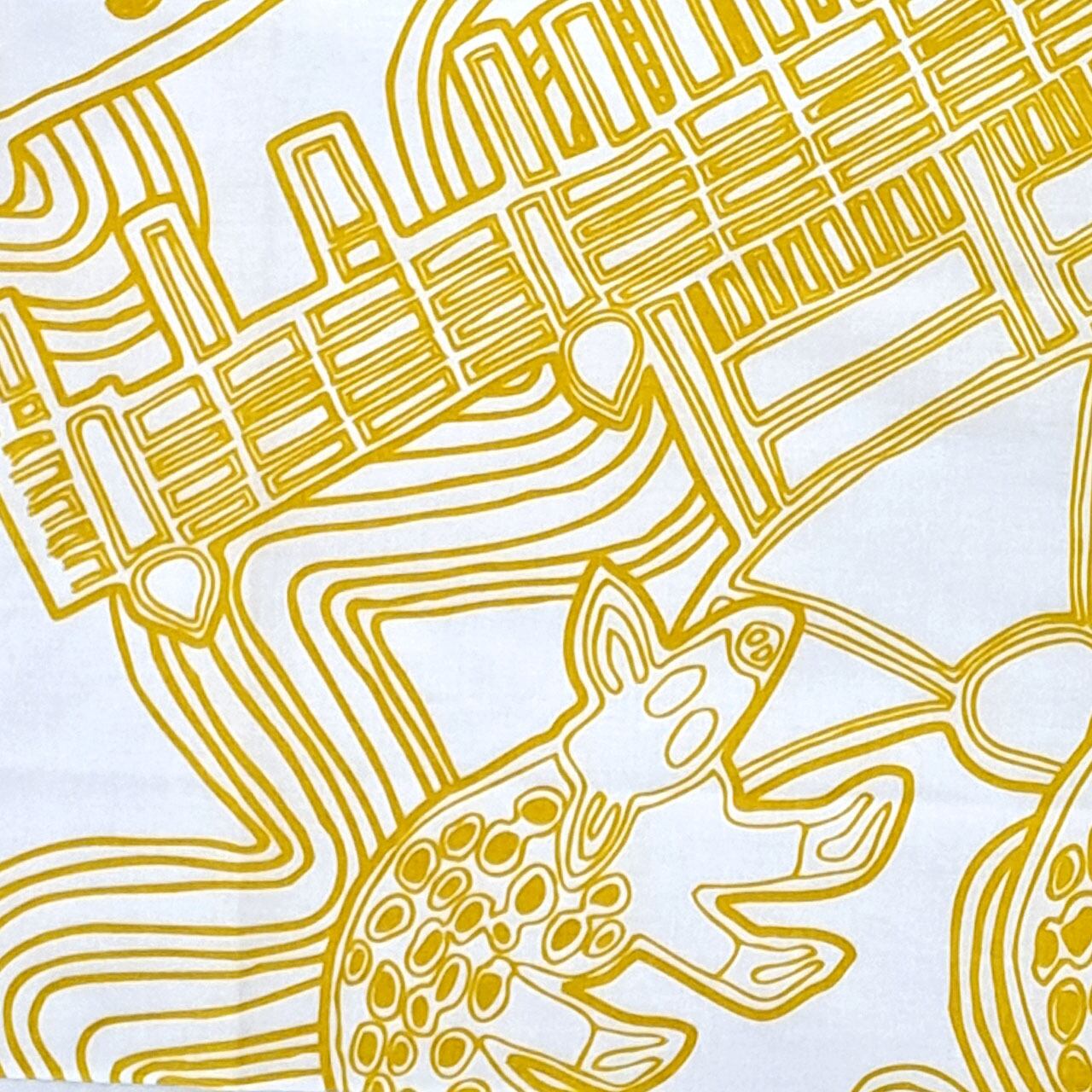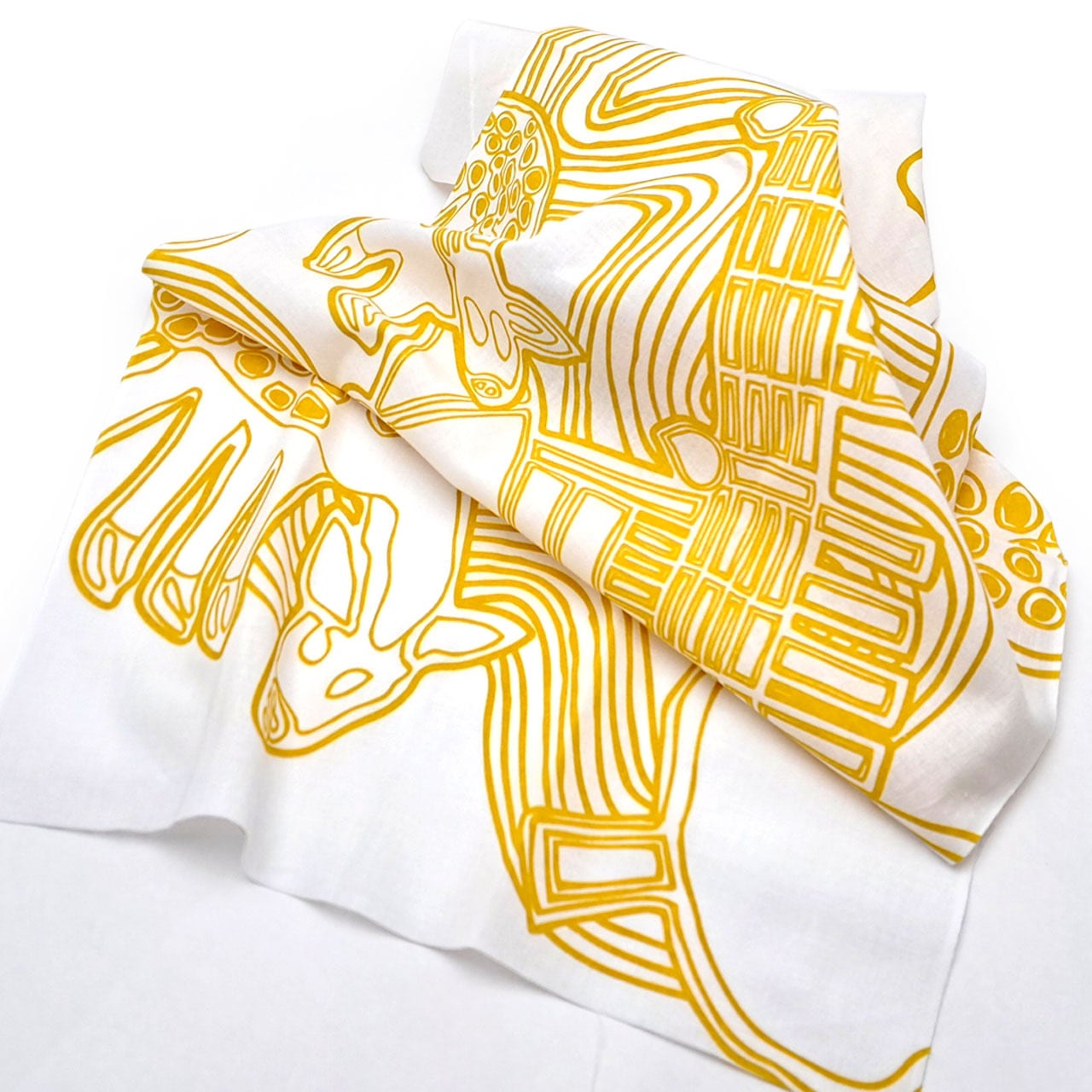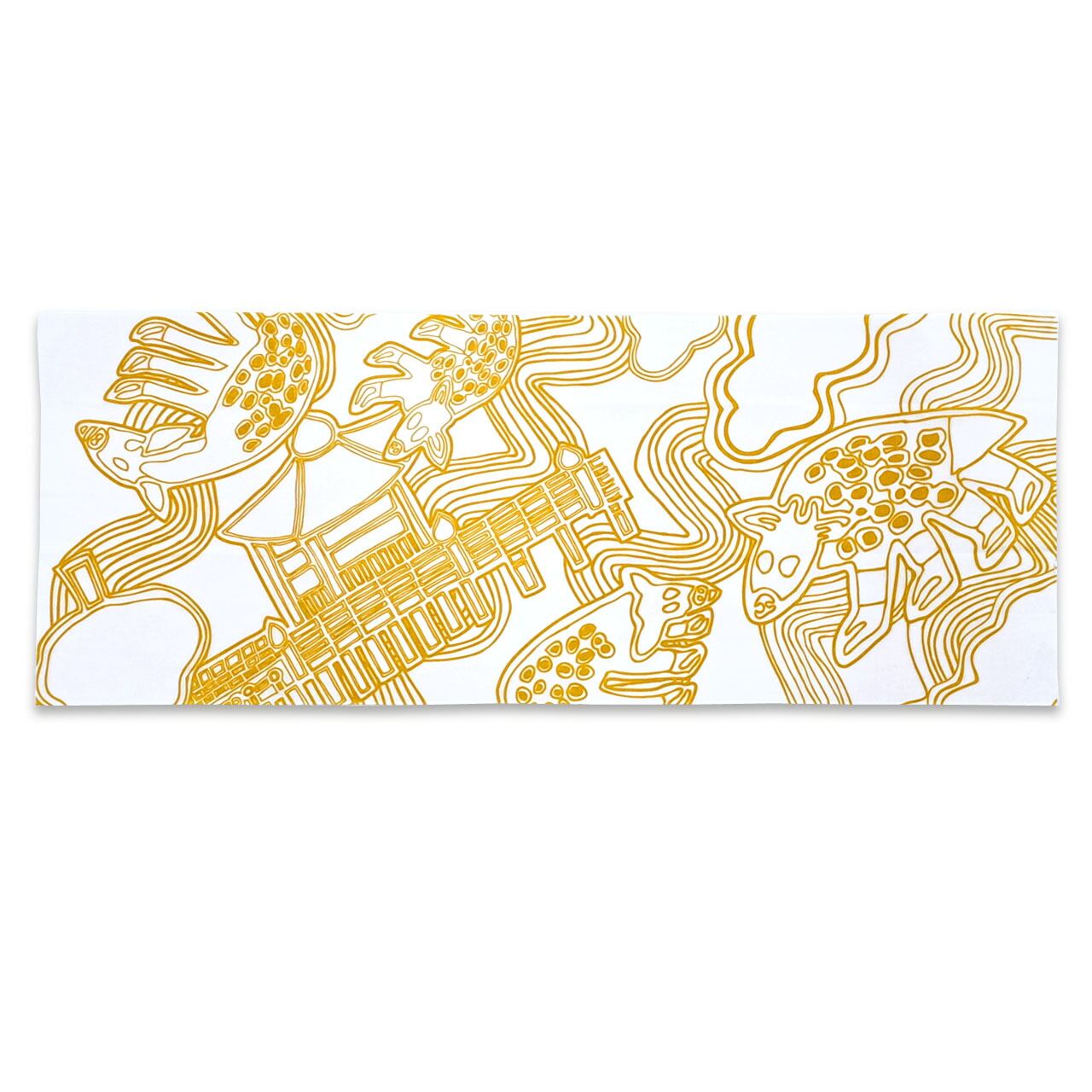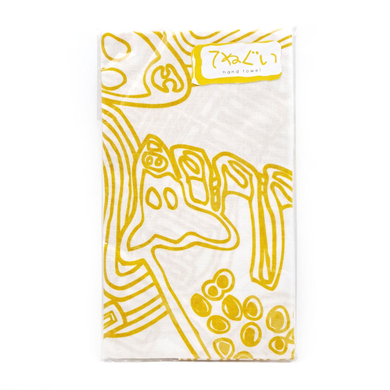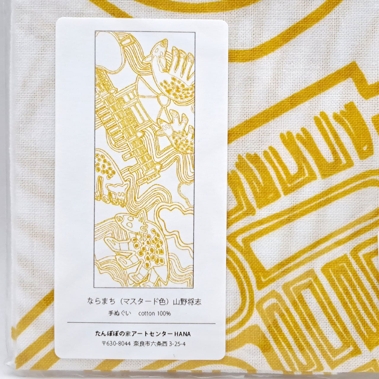 「たんぽぽの家 アートセンターHANA」の所在地でもある奈良を象徴するモチーフの寺院や鹿が流水模様や雲などと共にダイナミックに描かれた山野さんの代表作ともいえる「ならまち」が全面にわたりプリントされたアートな手ぬぐいです。
