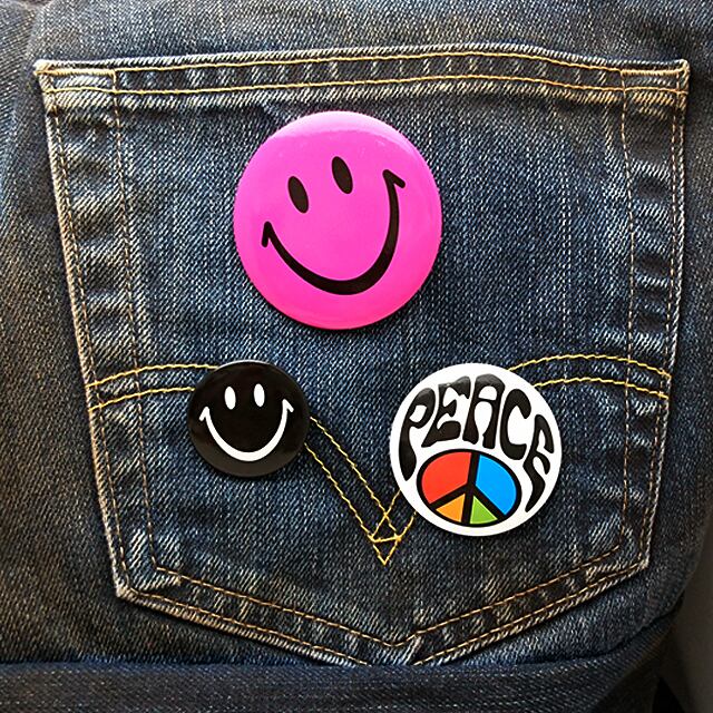 スマイリーとピースマークが3点セットになった缶バッジです。