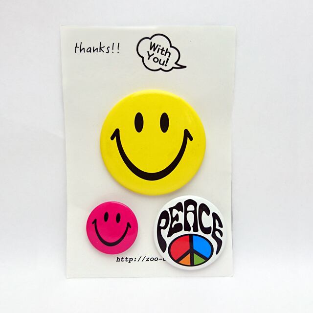 スマイリーとピースマークが3点セットになった缶バッジです。