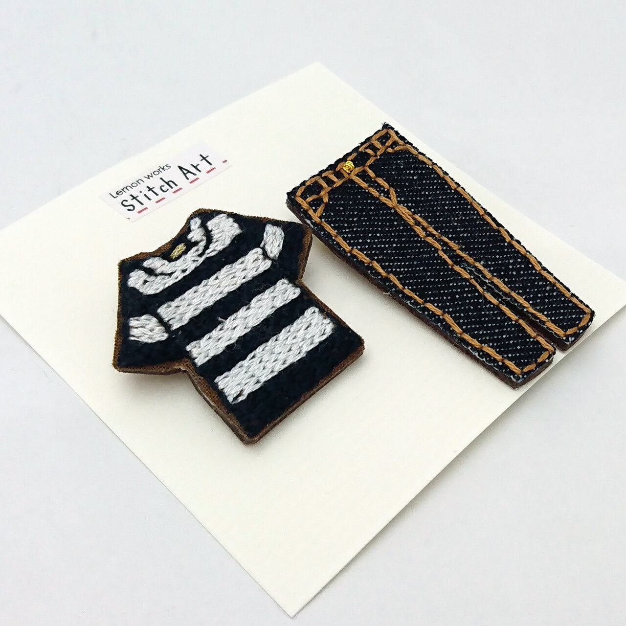 ボーダーTシャツにデニム、爽やかな夏イメージのセットアップのブローチです。