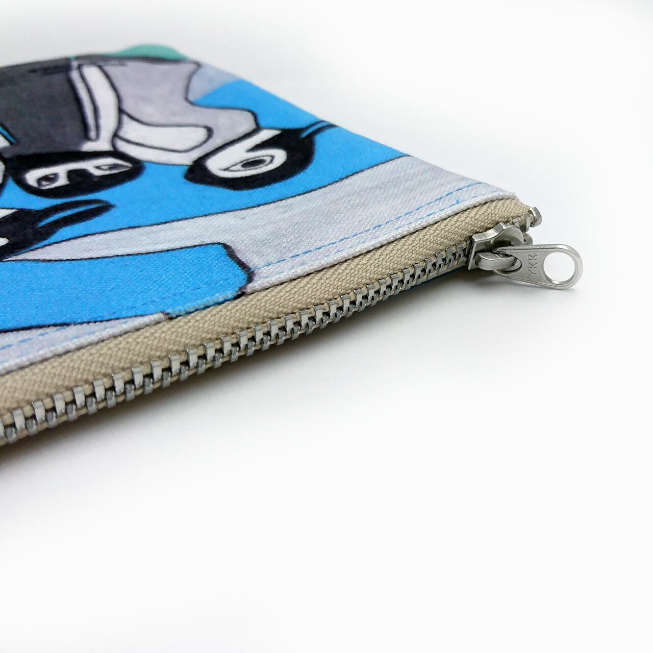 ヨチヨチ歩いてる感が、しっかりと伝わってきて、グッとくるほど可愛いペンギンの絵柄のフラットポーチです。ブルーとグレーというシックな色合いと、少し幾何学的にも見える感じが男性にもお使い頂ける絵柄です。