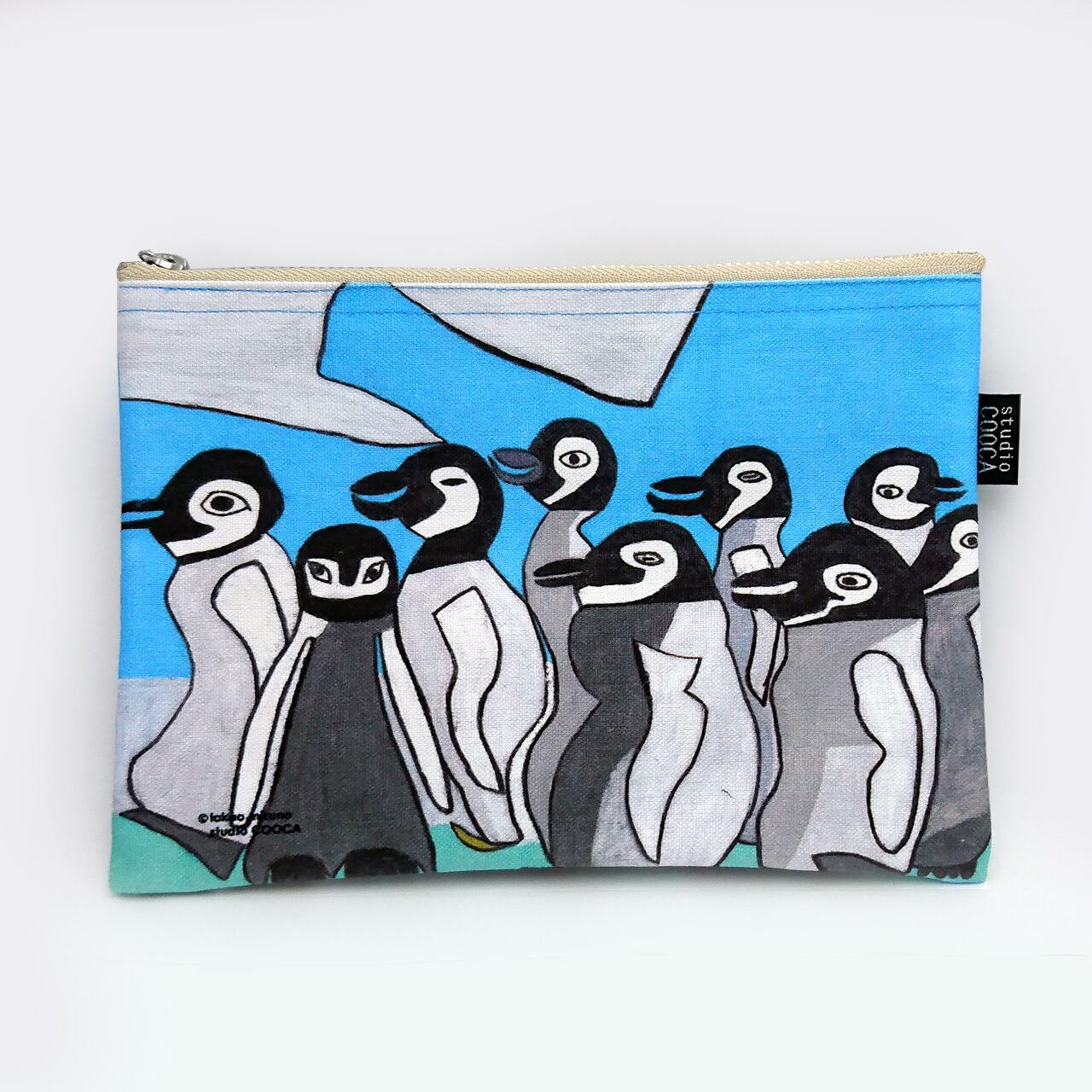 【studio COOCA】フラットポーチ「氷の上をヨチヨチ歩く9 羽の赤ちゃんペンギン」