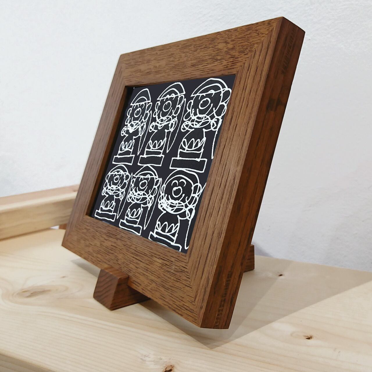 スタンド付きの木製のフレームは、れもんワークス内の「ギュイーン木工」で一つ一つ手作業でつくられており、木目が美しいナラ材を茶色に着色しています。