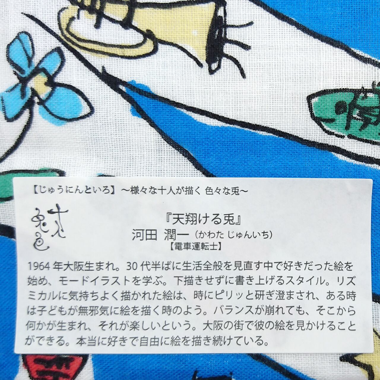 来年の干支「兎」をテーマに、10名のアーティストの描いた作品がモチーフになった『十人兎色』シリーズの手ぬぐいです。青い空にのびやかに飛翔するウサギが何とも晴れ晴れしい、見ているだけで元気になるようなこの作品は、大阪出身のイラストレーター河田 潤一氏の描いたもの。リズミカルなタッチと鮮やかな色彩、一見自由で無邪気に描かれているように見え、絶妙のバランス感覚、色彩感覚が独特の世界観を生んでいます。