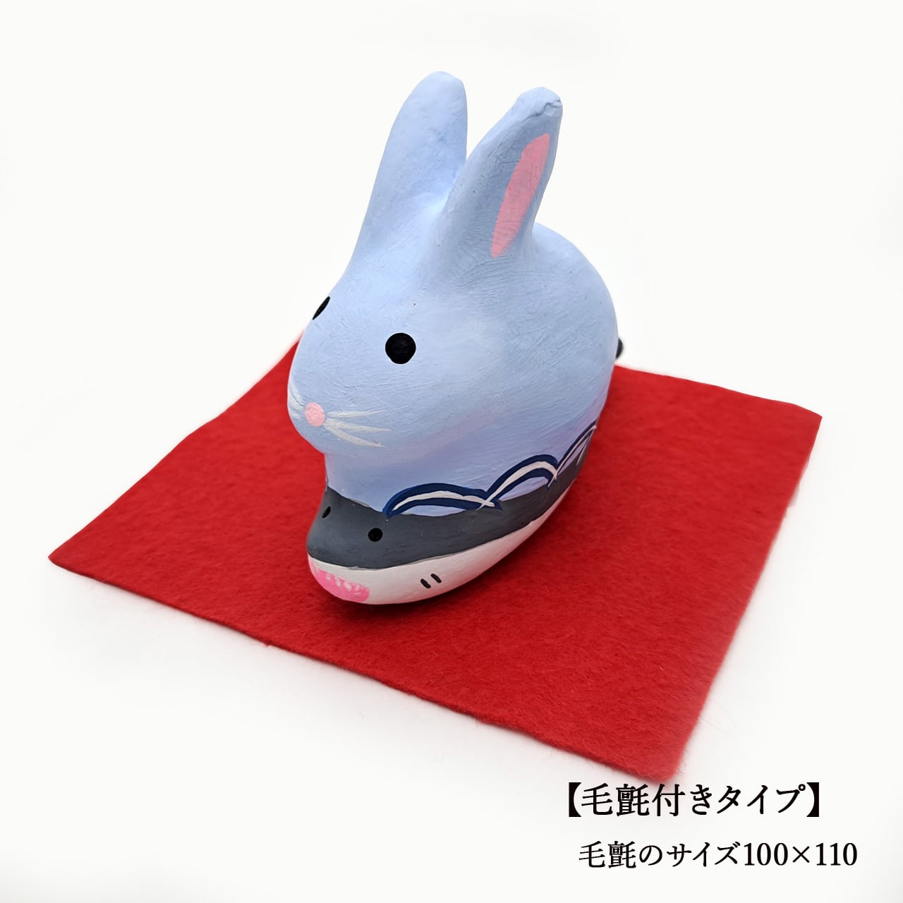 日本神話の出雲大社にまつわるエピソード「因幡の白兎」から発想を得た干支張り子です。サメの背中に乗って、隠岐の島から出雲へと海を渡ろうとするウサギとサメの姿がなんとも可愛い!ウサギの尻尾の部分には隠岐の島がデザインされています。