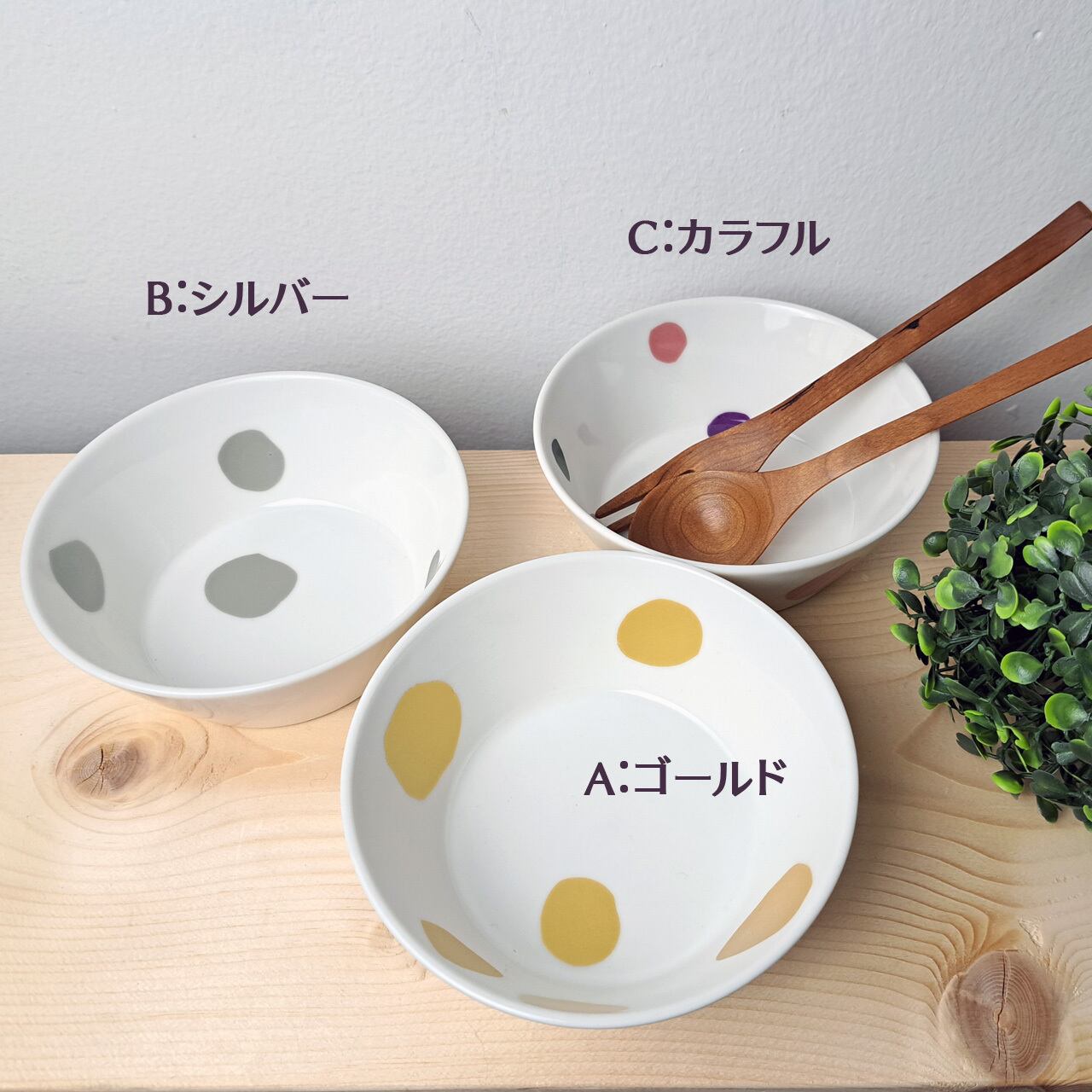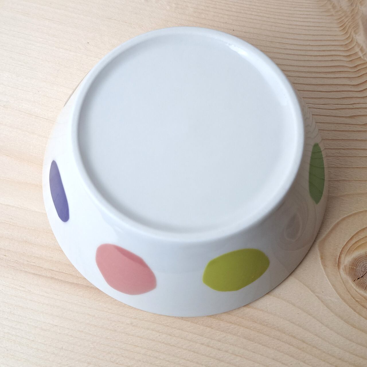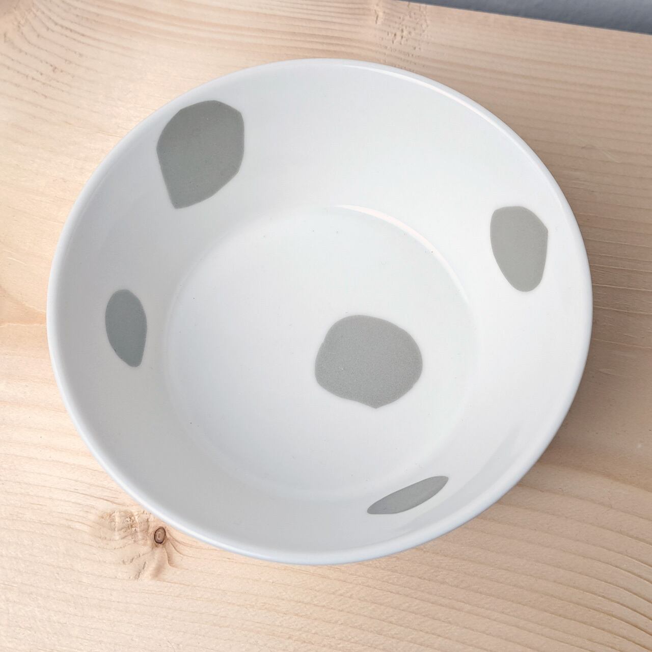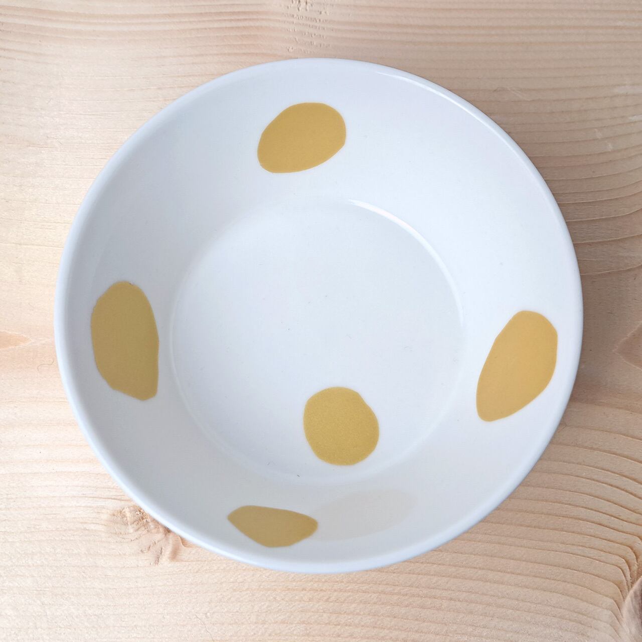 ちょっとゆがんだ「まる」たちが、まるでそれぞれの個性をもっているかのように、楽し気に食器の上に並んでいます。