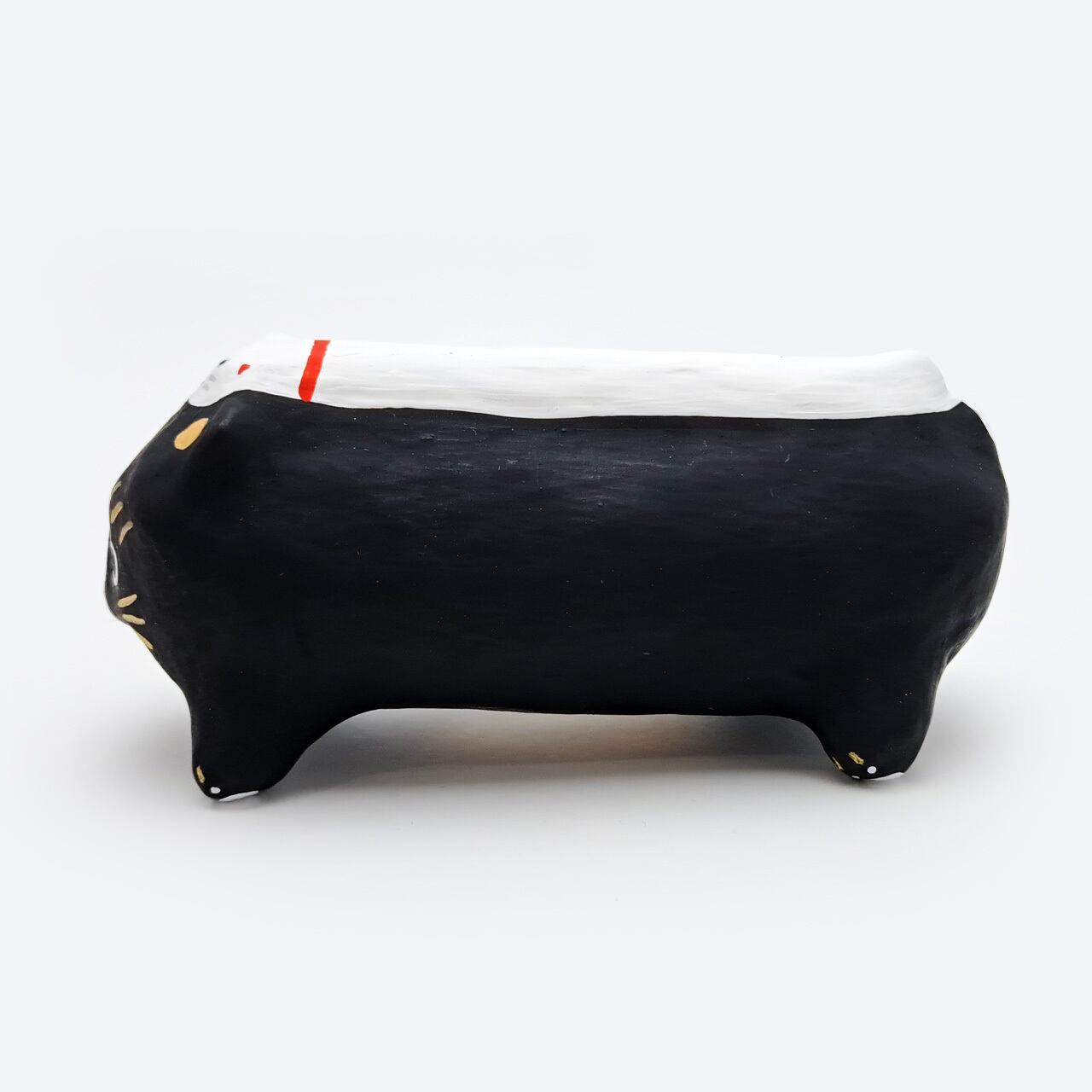 当ギャラリーで只今個展開催中のエイブルアートカンパニー登録アーティスト「中村真由美」さんの作品を元に作られた張り子の置き飾りです。「Good Jobセンター香芝」のオリジナルマスコット「Good Dog]」のスピンオフ商品で、今回はDOGではなく「招き猫」。背中に乗っかった白猫ちゃんが前足をちょこんと出して、福を招いています。土台になっている大きい方のネコちゃんのおなかの部分には、なんとも景気のいい大きな小判を隠し持っています。