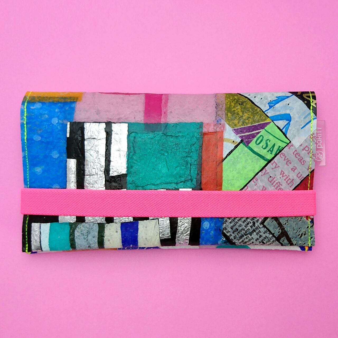 ポリフならではのポップ感たっぷりのマルチケース。ビビットなピンクのゴムバンドと黒にシルバーというアクセントが対照的で面白い!が通帳やパスポート、チケットなどを収納するにはピッタリ。また、マスク入れなどにも便利!撥水するので、除菌シートで拭くこともでき、常に清潔に保つことができます。