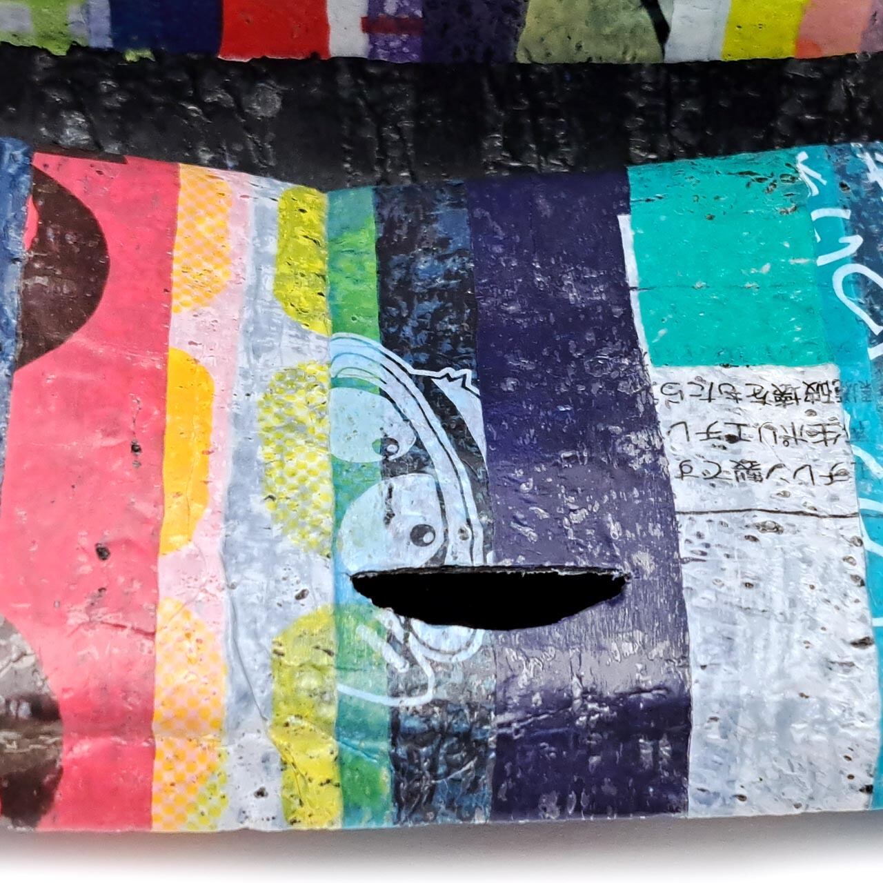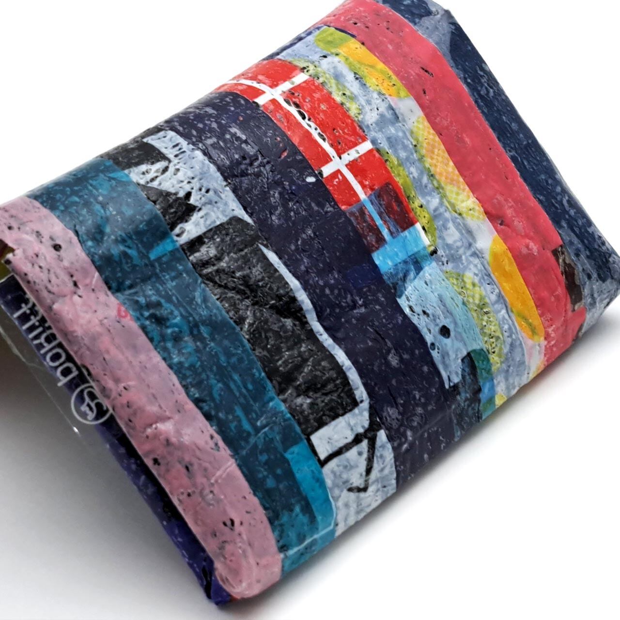 原材料のほどんどは、買い物をした時に貰うビニール袋や気泡入り緩衝材(所謂プチプチ)。それらをカットして、熱で圧着して完成するシートにコーラージュしたものを使用し、プロダクトに変えています。カラーはすべて買い物袋そのままの色。着色は一切していません。