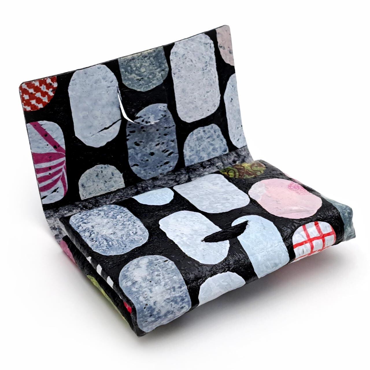 原材料のほどんどは、買い物をした時に貰うビニール袋や気泡入り緩衝材(所謂プチプチ)。それらをカットして、熱で圧着して完成するシートにコーラージュしたものを使用し、プロダクトに変えています。カラーはすべて買い物袋そのままの色。着色は一切していません。