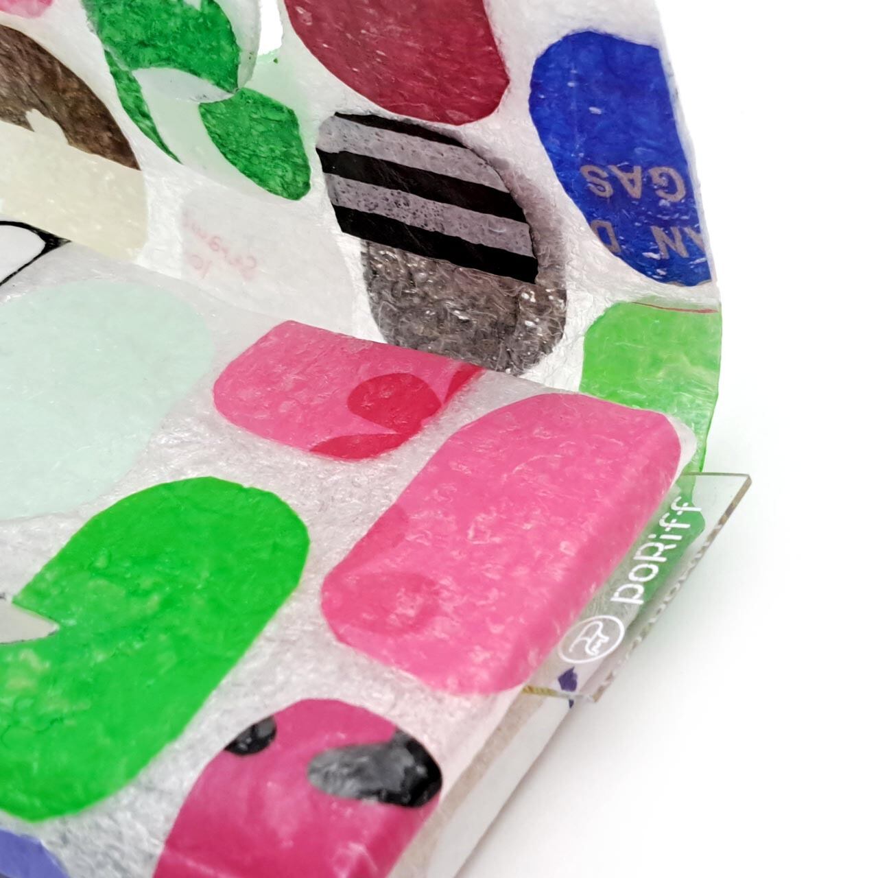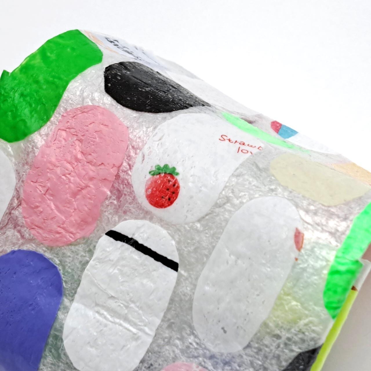 原材料のほどんどは、買い物をした時に貰うビニール袋や気泡入り緩衝材(所謂プチプチ)。それらをカットして、熱で圧着して完成するシートにコーラージュしたものを使用し、プロダクトに変えています。カラーはすべて買い物袋そのままの色。着色は一切していません。