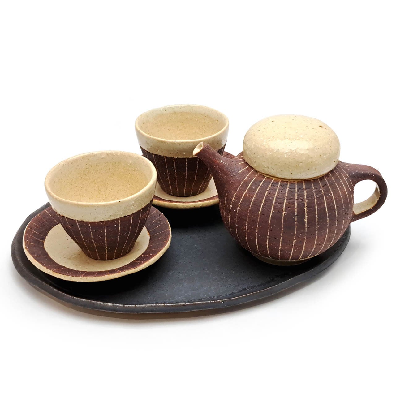 信楽の土の自然で優しい風合いと、海老茶と無垢のコントラスト。繊細な線文が美しいお茶碗です。こちらの「縦縞」の他、同型で「横縞」があります。