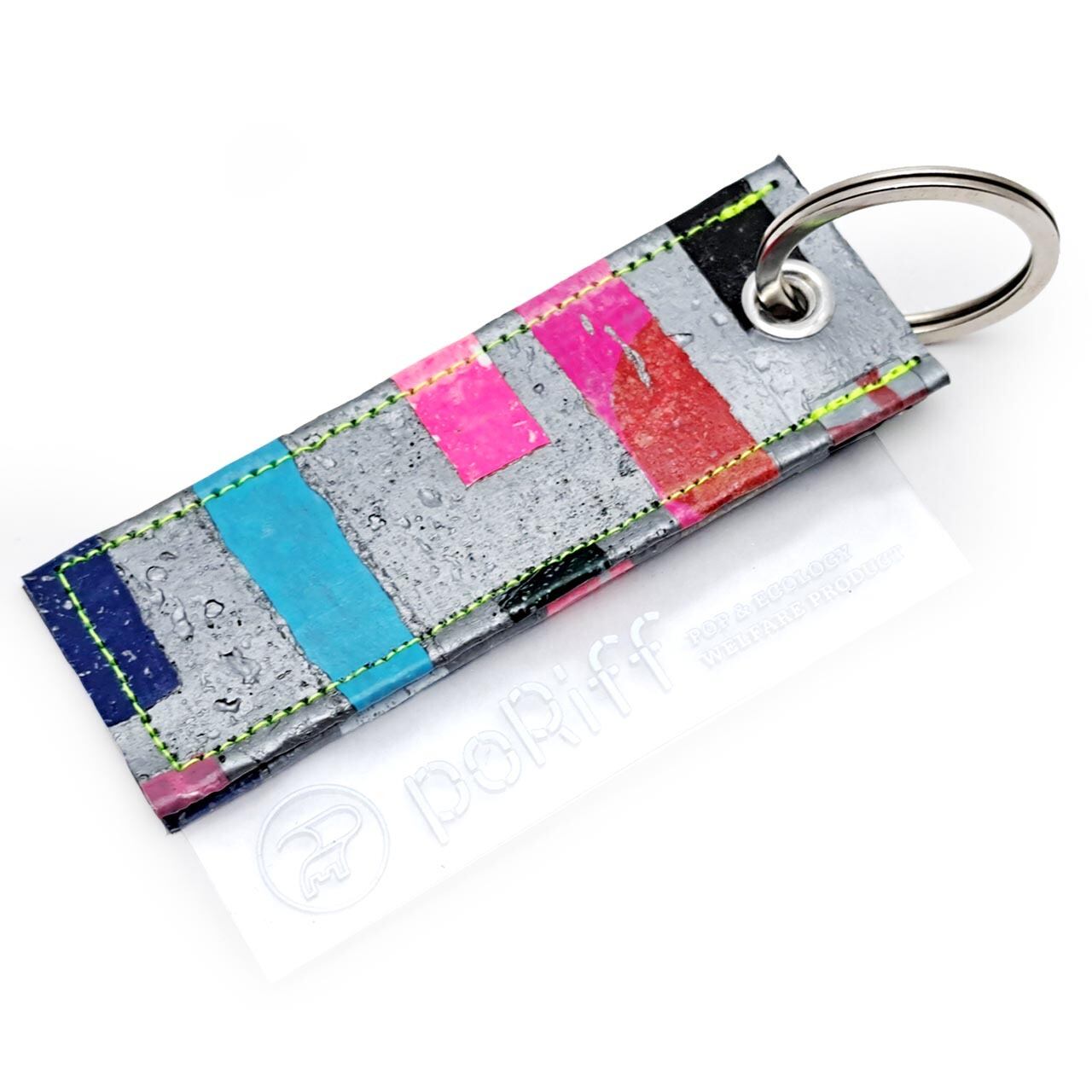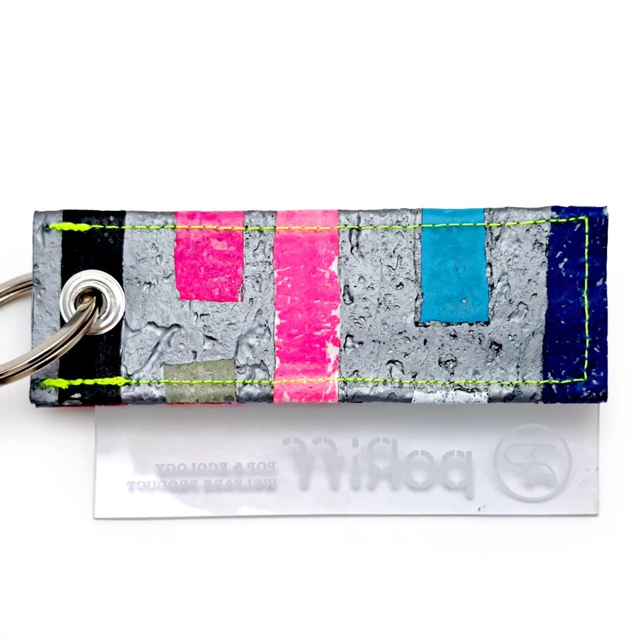 メタリックシルバーにピンクやブルーのパーツが絶妙に配置された、ポリフならではのポップ感が光るキーホルダーです。